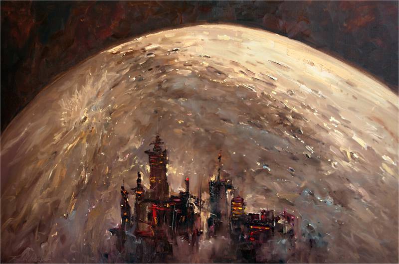 Na obrazie widzimy gigantyczny księżyc unoszący się nad miastem, zatopionym w tajemniczym mroku. Kolory są stonowane, dominują odcienie szarości i brązu, a jednak subtelnie migoczące czerwienie i pomarańcze dają poczucie ukrytej energii. Księżyc rozciąga się niemal na całej szerokości obrazu, jego powierzchnia pełna jest delikatnych, wirujących wzorów, przypominających plamy światła. Miasto poniżej, z ostrymi, geometrycznymi kształtami wieżowców, kontrastuje z łagodnością niebiańskiego ciała. Atmosfera dzieła jest nieco surrealistyczna, emanuje chłodnym spokojem, a jednocześnie budzi ciekawość. Artysta zastosował technikę impasto, grube pociągnięcia pędzlem nadają powierzchni obrazu fakturę, która przyciąga wzrok. Styl jest oniryczny, przesycony marzycielską aurą, jakby wyjęty z najdziwniejszej opowieści science fiction. Obraz może budzić w odbiorcy poczucie małości wobec ogromu wszechświata, a także zadumę nad ulotnością cywilizacji i jej światła w mrokach kosmosu. Myślę sobie: ale to fajne! Jak małe dziecko mogłoby opisać: „To miasto na księżycu!” Może to być metafora izolacji, samotności w wielkim świecie, a może odwrotnie – poczucie bycia częścią czegoś naprawdę wielkiego. A gdy spojrzymy jeszcze raz, to "wow", magia kosmosu otwiera przed nami swoje tajemnice.