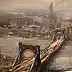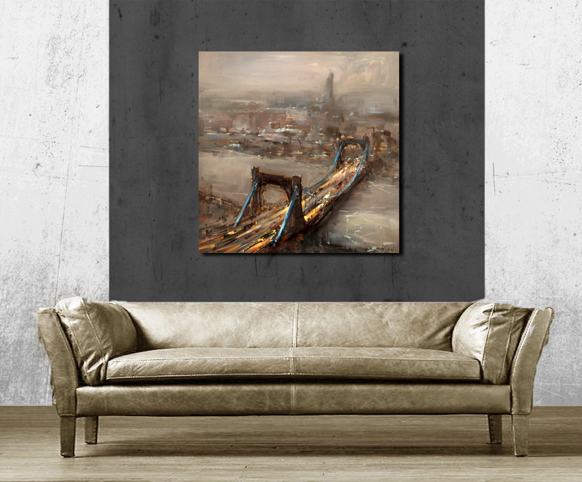 Na obrazie widzimy most rozciągający się majestatycznie ponad rzeką, zanurzony w nieco przytłumionym świetle miejskiego wieczora. Kolory dominujące to brązy i szarości, które nadają całości mglisty, tajemniczy klimat. Tu i ówdzie przebłyskują jasne punkty świateł samochodów jak małe iskierki, dodając życia statycznej scenerii. Most wydaje się prowadzić gdzieś daleko, w wieczną mgłę, gdzie horyzont tylko delikatnie zarysowany. Styl artysty jest impresjonistyczny, z widocznymi pociągnięciami pędzla, co nadaje obrazowi dynamiczny charakter. Technika autorstwa pozwala poczuć ruch, mimo że przedstawiona scena jest statyczna. To trochę jak oglądanie miasta przez zamglone okno w czasie deszczu. Patrząc na ten obraz czuję nostalgia, tęskne echo wędrówki i poszukiwania. Czy to miasto, czy most za rzeką snów? "Patrz mamo, to niebieskie światła wyglądają jak magiczne koraliki!" wykrzyknęłoby dziecko zachwycone scenerią. Obraz ten może wywoływać w odbiorcy zarówno uczucie spokoju, jak i ekscytacji możliwością nieznanej podróży. The sense of adventure jest niemal namacalny. Można niemal poczuć chłodny powiew wiatru od rzeki i cichy, daleki szum samochodów. Ten magiczny kawałek sztuki przenosi nas w świat, gdzie wszystko jest możliwe, mimo owijającej go mgły.