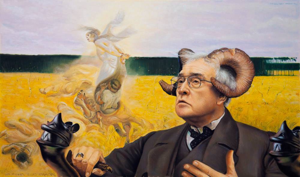Na obrazie dominują intensywne żółcie pola i głęboki błękit nieba. Postać mężczyzny na pierwszym planie, z rogami barana i zamyślonym spojrzeniem, przyciąga wzrok swoją niezwykłością. W tle widać dynamiczną sylwetkę anioła, unoszącego się nad sceną pełną ruchu i chaosu. Kompozycja dzieła jest zrównoważona, a artysta z wprawą oddaje kontrast między nieruchomą ciszą a tętniącym życiem tła. Nastrój obrazu jest nieco surrealistyczny, wręcz tajemniczy. Dzięki połączeniu snu z jawą i fantazji z rzeczywistością, tworzy się klimat pełen pytań. Techniki malarskie wskazują na rękę mistrza - precyzyjne pociągnięcia pędzla i subtelna gra światłocienia nadają obrazowi głębokość i wyrazistość. Widz może poczuć niepokój i fascynację. "Wow, ale dziwne!", mógłby powiedzieć siedmiolatek. Obraz prowokuje do refleksji nad naturą ludzkiej tożsamości i jej symbolami. To prawdziwy "mind-blowing" dla każdego, kto na niego spojrzy. Osobiście czuję, że mogłoby to być marzenie senne lub metafora życia. Dzieło jest pełne emocji i osobistych interpretacji, które zostają z nami na długo.
