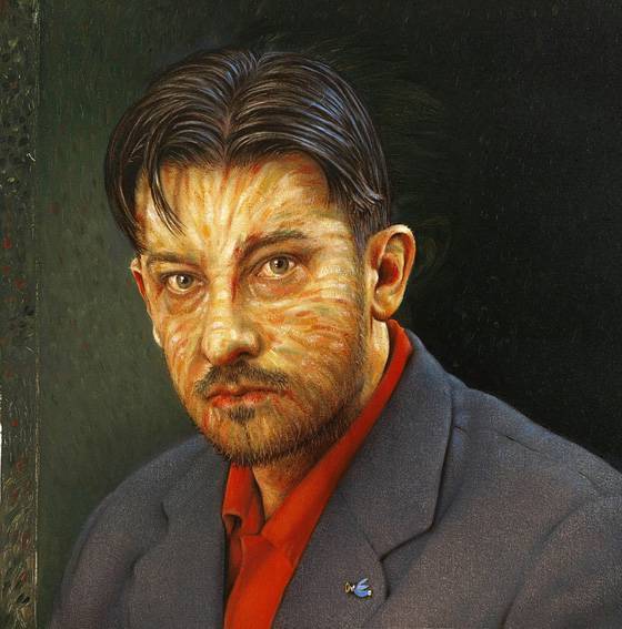 Na obrazie widać portret mężczyzny, który przyciąga wzrok swoją intensywnością i unikalnym stylem. Twarz jest pełna jasnych, pomarańczowych i czerwonych pociągnięć pędzla, które wyglądają jak linie światła tańczące po skórze. Jego włosy są ciemne i gładko zaczesane, co kontrastuje z dynamicznymi wzorami na twarzy. Garnitur w szarościach i głęboko czerwone tło podkreślają głębię wyrazu. Atmosfera obrazu jest nieco enigmatyczna, wywołując mieszankę fascynacji i niepokoju. Patrząc na niego, można poczuć napięcie, jakby za każdym pociągnięciem pędzla kryła się jakaś tajemnica. Stylistycznie dzieło łączy realizm z elementami abstrakcji. Pociągnięcia pędzla są starannie przemyślane, ale dodają chaosu, który przyciąga wzrok i nie pozwala oderwać się od obrazu. Dziecku mogłoby się wydawać: Ta twarz jest cała w kolorach, jakby ktoś narysował po niej kredkami. Mieszanka stylu i emocji sprawia, że obraz staje się nie tylko wizualnym odbiciem, ale i emocjonalnym doświadczeniem. "Wow!" — to słowo wychodzi naturalnie, bo obraz jest pełen zaskoczeń i niespodzianek. Prawdziwy majstersztyk, który pozostawia widza z głową pełną pytań i myśli.