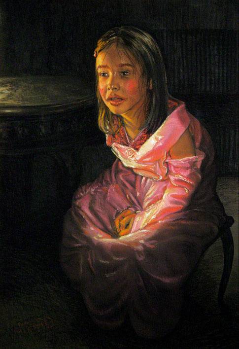 Obraz przedstawia młodą dziewczynkę w różowej sukience, siedzącą w półmroku. Światło pada na jej twarz, podkreślając delikatne rysy i wyraz zadumy. Kolory są ciepłe, przeważają różowe i pomarańczowe odcienie, co dodaje kompozycji miękkości i subtelności. Ciemne tło tworzy kontrast z jasnymi partiami, nadając obrazowi głębię. Wyczuwalny nastrój to mieszanka spokoju i tajemniczości, jakbyśmy byli świadkami jej intymnej chwili refleksji. Czuć tu coś magicznego, takiego "je ne sais quoi", co przyciąga wzrok. Styl obrazu to realistyczna technika malarska z domieszką impresjonizmu. Artysta starannie oddaje detale, używając miękkich pociągnięć pędzla, co nadaje dziełu lekkości. Patrząc, można się poczuć, jakbyśmy słuchali szeptu. Obraz wywołuje emocje ukrytego piękna i niewinności dzieciństwa. Może nawet pewną nostalgię za dawno utraconym czasem beztroski. Mam wrażenie, że dziewczynka myśli o czymś bardzo ważnym. Może o zabawie na łące? Jest coś w jej spojrzeniu, co zawiera w sobie cały wszechświat dziecięcych marzeń. Całość skłania do zastanowienia się nad upływem czasu, nad chwilami, które są ulotne jak dmuchawce na wietrze. Wzrusza mnie to. Obraz pełen emocji i finezji, który na długo zapada w pamięć. Każdy detal zachęca do ponownego przyjrzenia się i odkrywania nowych znaczeń.