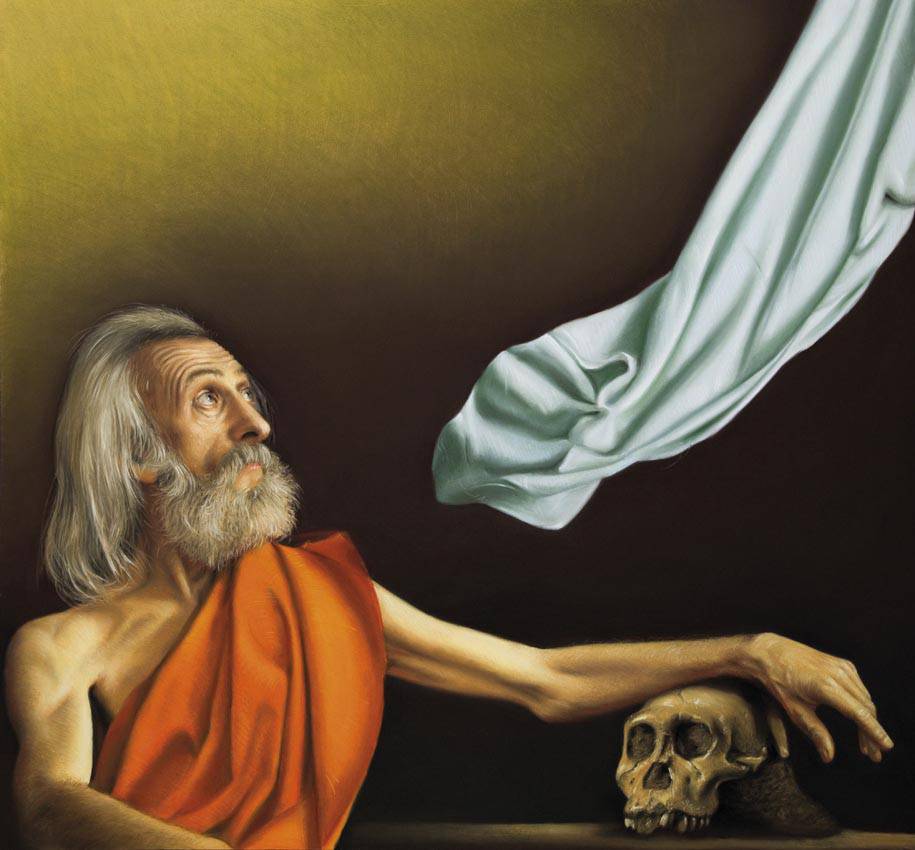 Na obrazie widać starca z długą, siwą brodą, owitego pomarańczowym materiałem, który kontrastuje z ciemnym tłem. Jasne światło oświetla jego twarz, podkreślając zmarszczki i skupiony wzrok. Tkanina, która płynie w powietrzu niczym duch, jest biaława, ale w cieplejszym tonie. Gdy patrzę na czaszkę, na której spoczywa jego ręka, czuję mieszankę niepokoju i refleksji. "Ciekawe, co on teraz myśli?" – przyszło mi do głowy. Atmosfera jest pełna zadumy, jakby czas się zatrzymał. Obraz emanuje spokojem, ale też tajemniczością. Technika artystyczna przypomina mi coś klasycznego, pełnego detali i dbałości o światło i cien. Artysta zastosował chiaroscuro, tworząc dramatyczny kontrast między światłem a ciemnością, co dodaje głębi i ekspresji całości. Wow, efekt jest naprawdę striking! Dzieciak powiedziałby: "Ten pan chyba o czymś ważnym myśli". Indywidualne interpretacje mogą prowadzić do rozmyślania nad sensem życia czy przemijaniem czasu. Gdy myślę o tym obrazie, czuję się jakbym zanurzał się w głąb własnych myśli, gdzie realistyczne detale łączą się z abstrakcją emocji. Truely, to sztuka, która mówi więcej, niż widać na pierwszy rzut oka.