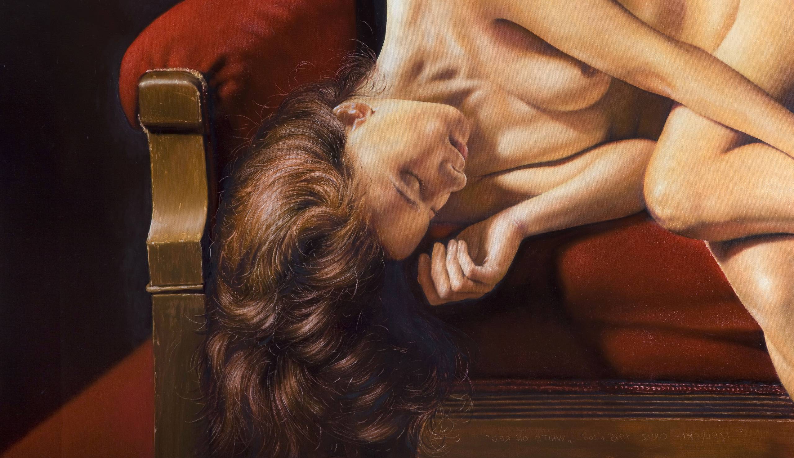 Na obrazie widzimy subtelnie splecioną postać, tajemniczo spoczywającą na głębokim, czerwonym tle. Dominują miękkie cienie i rozproszona gra świateł, które delikatnie podkreślają krągłości i naturalne zagięcia ciała. Kolorystyka jest ciepła, z przewagą odcieni kości słoniowej i tłumiącej czerwieni. Obraz emanuje spokojem i intymnością, jak moment złapany między snem a jawą. Artysta używa techniki chiaroscuro, która dodaje głębi i trójwymiarowości. Emocje? Ach, to coś jak nostalgia, subtelny smutek, ale też niesamowite piękno skryte w prostocie chwili. Mamo, ta pani śpi na fotelu! Przywołuje to refleksję o kruchości ludzkiej formy, delikatnej jak pióro na wietrze. To obrazuje takim czymś jak "serenity" w duszy. Można by godzinami patrzeć, odkrywając nowe emocje i myśli, które pojawiają się niczym fale na spokojnym jeziorze.
