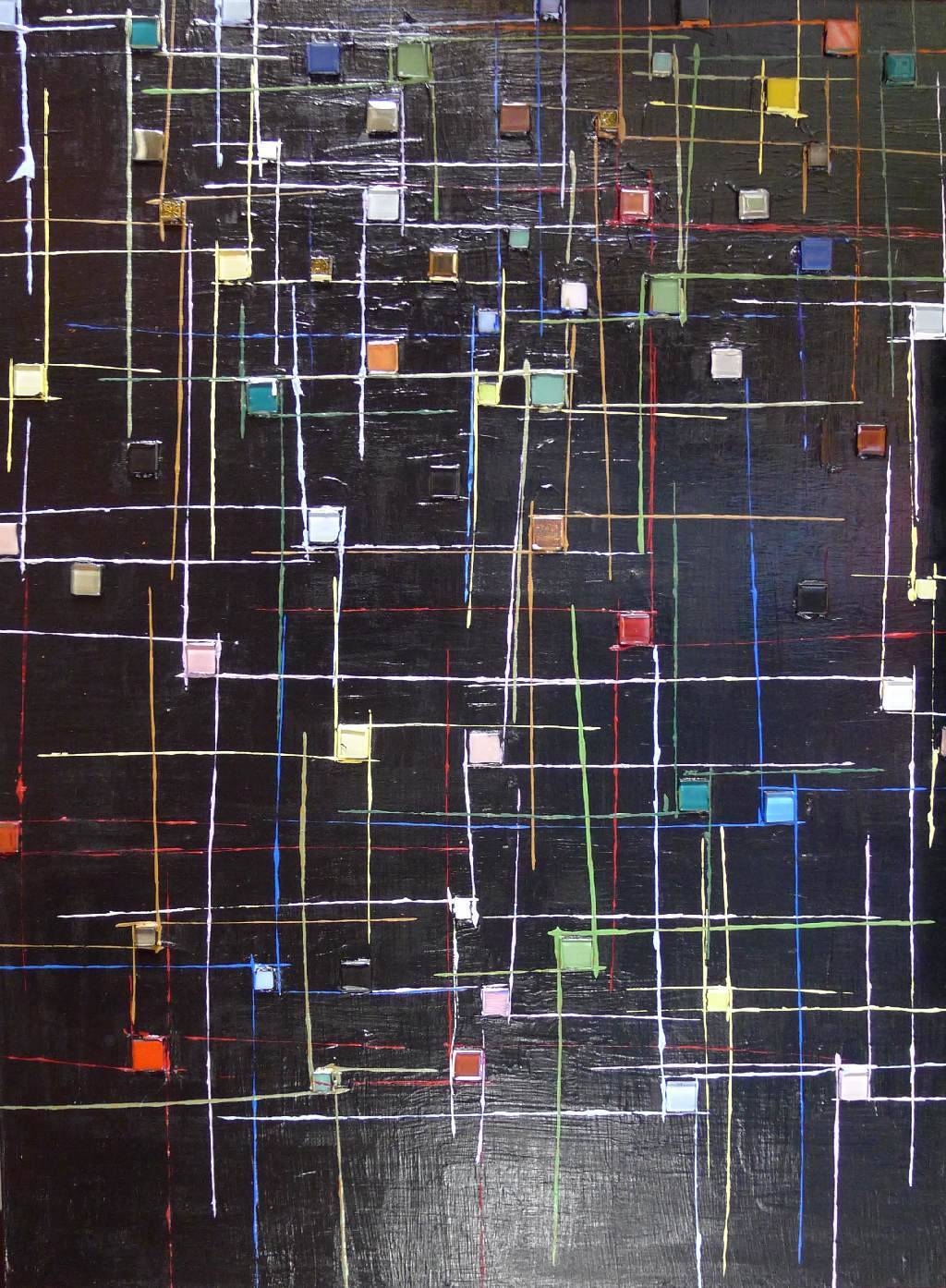 Obraz akrylowy, kolaż, elementy mozaiki, podłoże płyta, krawędzie zamalowane w tonacji obrazu,pogrubione do 4,5 cm ,werniksowany,sygnowany,przygotowany do powieszenia w dowolnej pozycji,powierzchnia obrazu fakturalna,tonacja czernie i elementy wielokolorowe.