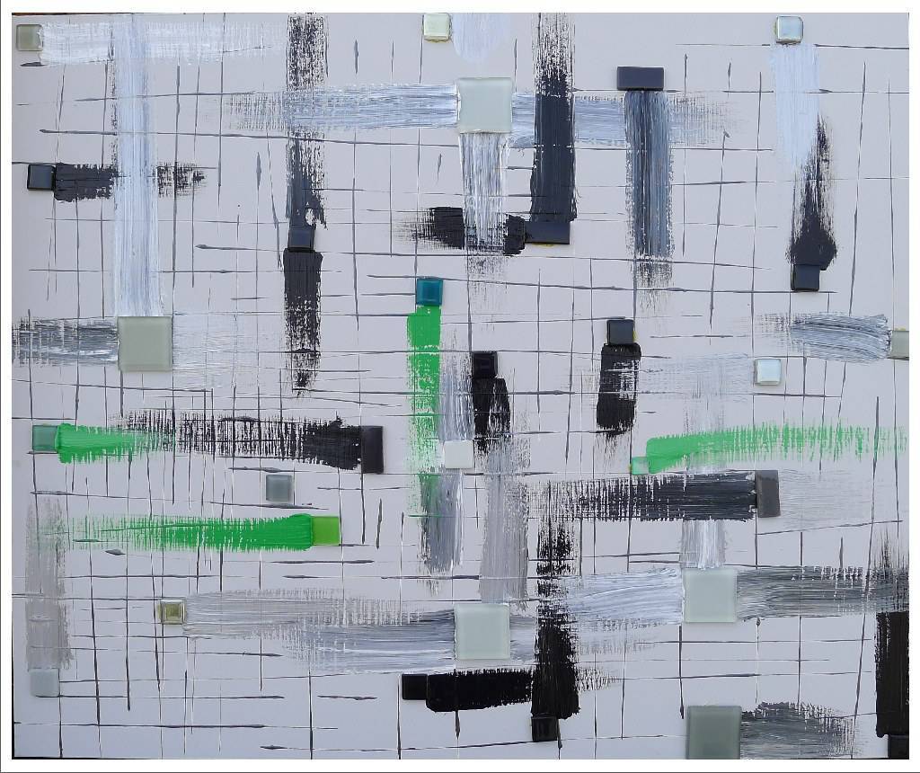 Obraz akrylowy,kolaż,elementy mozaiki, możliwość dowolnej konfiguracji,werniksowany,sygnowany,przygotowany do powieszenia, podobrazie płyta laminowana, tonacja szaro-czarno- limonkowa,przygotowany do powieszenia, wymiar 80 cm x 67 cm idealny do nowoczesnego wnętrza.