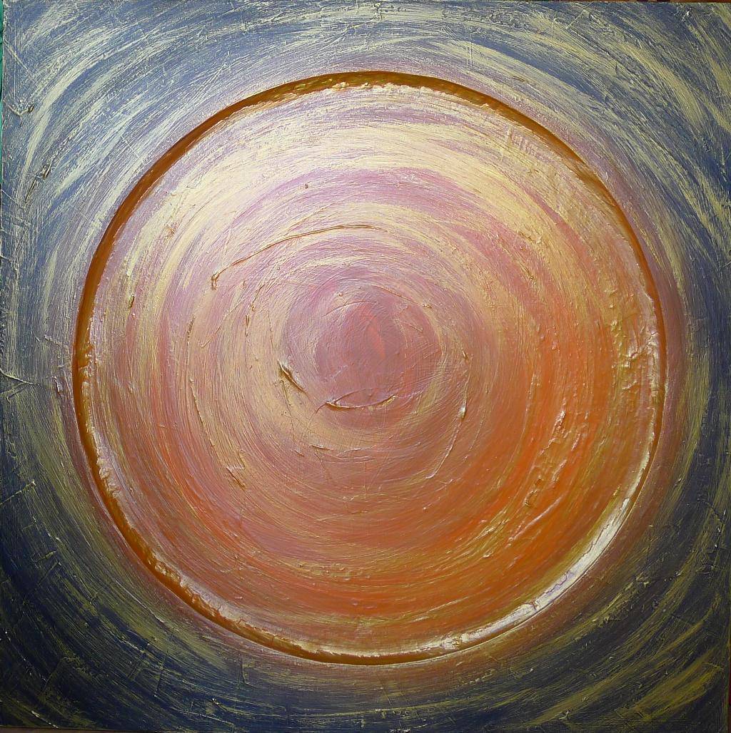Obraz akrylowy, technika własna, autorskie trójwymiarowe podobrazie, kolaż, zamalowane krawędzie obrazu w tonacji tła, bez potrzeby ramy, przygotowany do powieszenia, lakierowany, idealny do salonu, sypialni lub na prezent, wymiar 100 cm x 100 cm, tonacja pomarańczowo - czarno-złota.