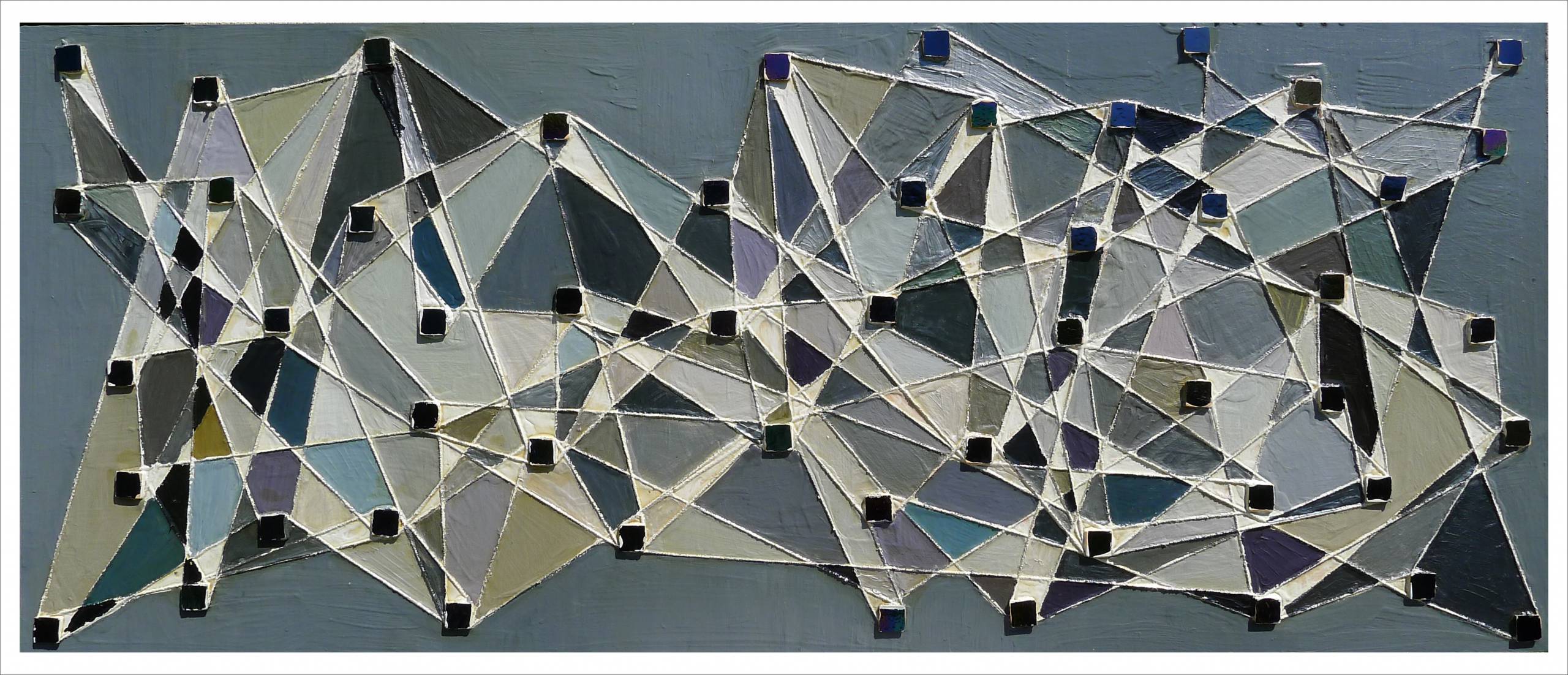 Obraz akrylowy, kolaż, elementy szkła, sznurka, podłoże płyta mdf , krawędzie zamalowane w tonacji obrazu,werniksowany,sygnowany,przygotowany do powieszenia w pionie i poziomie , powierzchnia obrazu fakturalna,tonacja szarości i biele..Wymiar 60 cm x 145 cm.