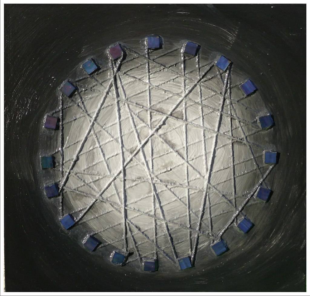 Obraz akrylowy,technika mieszana,elementy mozaiki,sznurka, podłoże płyta , przygotowany do powieszenia – nafrezowania umożliwiające powieszenie obrazu bez potrzeby ramy i dodatkowych mocowań, boki zamalowane w tonacji obrazu, werniksowany, sygnowany,wymiar 40 cm x 40 cm.