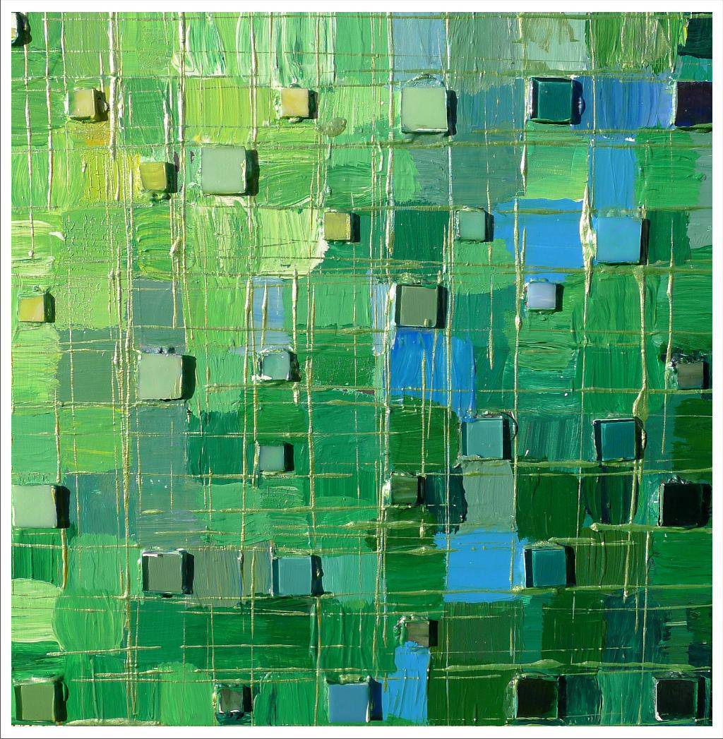 Obraz akrylowy,technika mieszana,elementy mozaiki, podłoże płyta , przygotowany do powieszenia – nafrezowania umożliwiające powieszenie obrazu bez potrzeby ramy i dodatkowych mocowań, boki zamalowane w tonacji obrazu, werniksowany, sygnowany,wymiar 40 cm x 40 cm.Możliwość powieszenia w dowolnej pozycji.