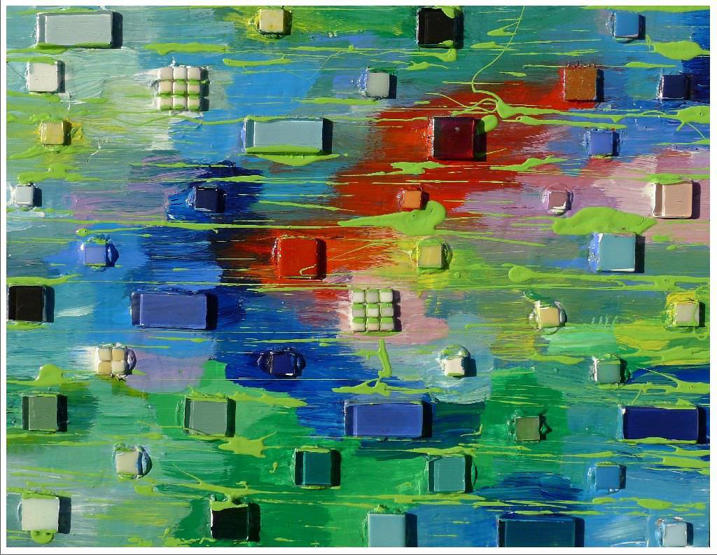 Obraz akrylowy, kolaż,elementy ceramiki,mozaiki,podobrazie płyta,przygotowany do powieszenia w dowolnej konfiguracji, krawędzie zamalowane w tonacji obrazu, wymiar 45 cm x 35cm.