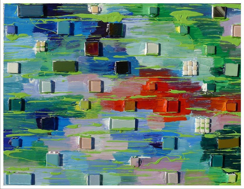 Obraz akrylowy, kolaż,elementy ceramiki,mozaiki,podobrazie płyta,przygotowany do powieszenia w dowolnej konfiguracji, krawędzie zamalowane w tonacji obrazu, wymiar 45 cm x 35cm.