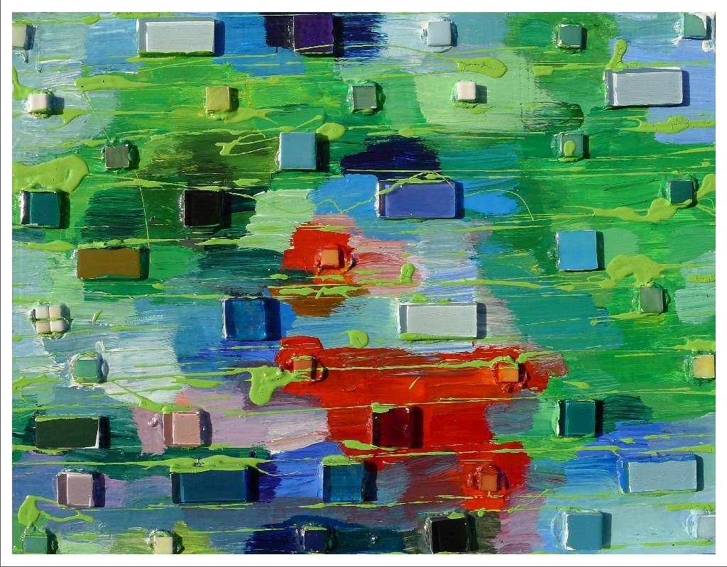 Obraz akrylowy, kolaż,elementy ceramiki,mozaiki,podobrazie płyta,przygotowany do powieszenia w dowolnej konfiguracji, krawędzie zamalowane w tonacji obrazu, wymiar 45 cm x 35cm.