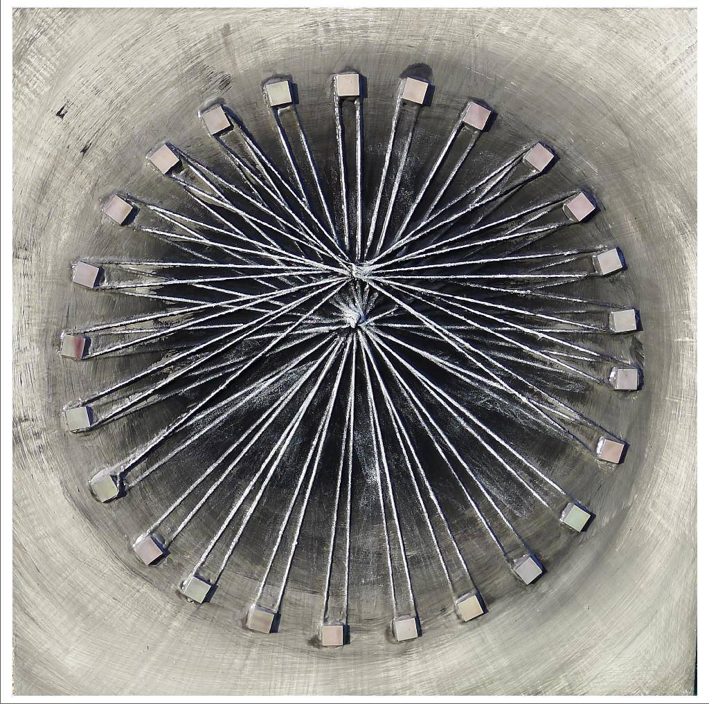 Obraz akrylowy,technika mieszana,elementy mozaiki, podłoże płyta , przygotowany do powieszenia – nafrezowania umożliwiające powieszenie obrazu bez potrzeby ramy i dodatkowych mocowań, boki zamalowane w tonacji obrazu, werniksowany, sygnowany,wymiar 50 cm x 50cm.Możliwość powieszenia w dowolnej pozycji.