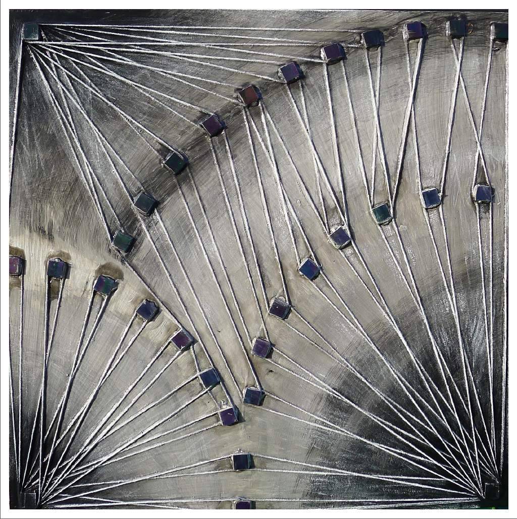 Obraz akrylowy,technika mieszana,elementy mozaiki, podłoże płyta , przygotowany do powieszenia – nafrezowania umożliwiające powieszenie obrazu bez potrzeby ramy i dodatkowych mocowań, boki zamalowane w tonacji obrazu, werniksowany, sygnowany,wymiar 50 cm x 50cm.Możliwość powieszenia w dowolnej pozycji.