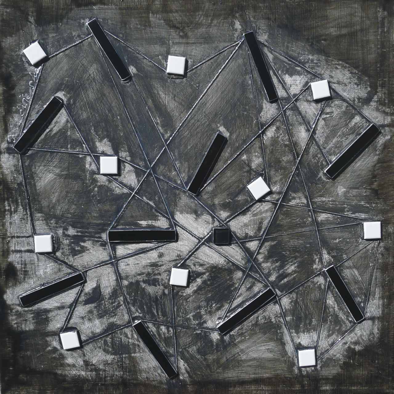 Obraz akrylowy, technika mieszana, elementy ceramiki, podłoże płyta mdf, krawędzie pogrubione do 16 mm, przygotowany do powieszenia w dowolnej pozycji bez potrzeby ramy i dodatkowych mocowań, fakturalny, boki zamalowane w tonacji obrazu, werniksowany, sygnowany, wymiar 60 cm x 60 cm.