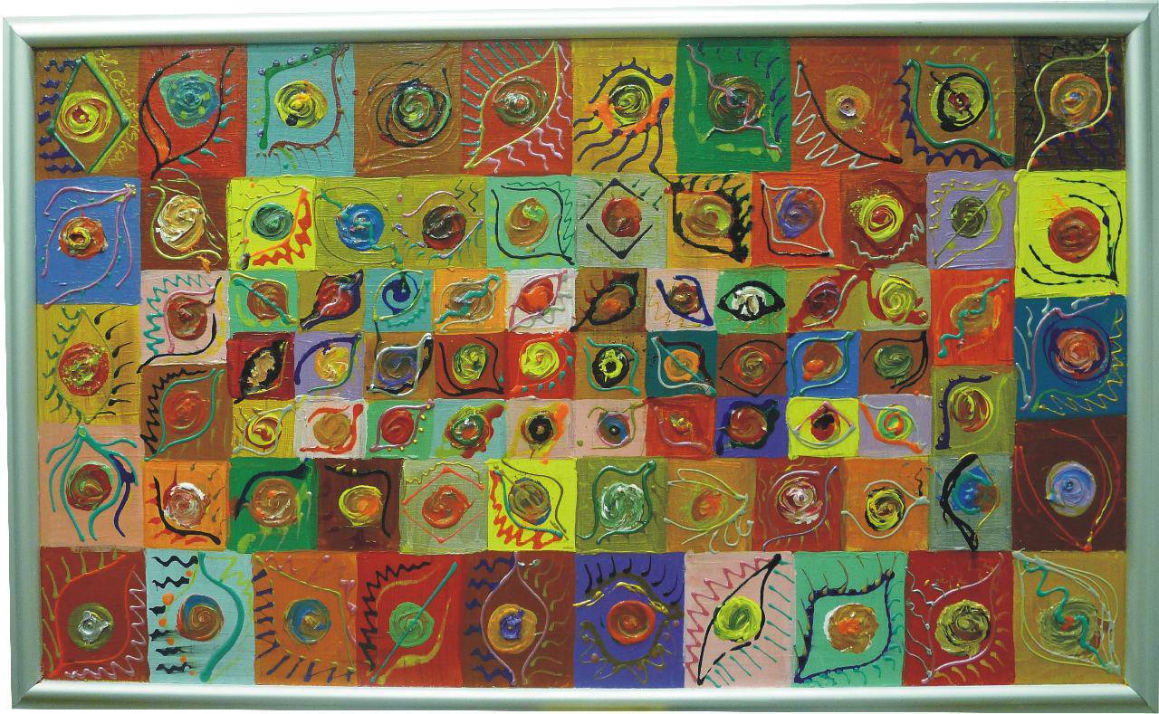 Obraz akrylowy, technika mieszana, podłoże płyta mdf ,rama aluminium, przygotowany do powieszenia w dowolnej pozycji bez potrzeby ramy i dodatkowych mocowań, fakturalny, boki zamalowane w tonacji obrazu, werniksowany, sygnowany, wymiar 95cm x 58 cm.