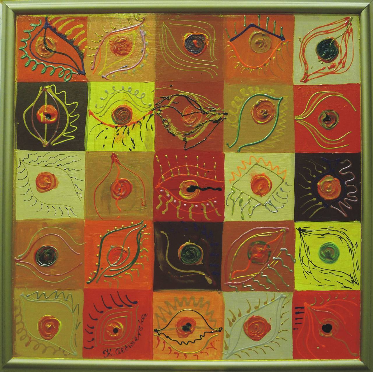 Obraz akrylowy, technika mieszana, podłoże płyta mdf ,rama aluminiowa w kolorze satyny – odcień brązu, przygotowany do powieszenia w dowolnej pozycji bez potrzeby ramy i dodatkowych mocowań, fakturalny, boki zamalowane w tonacji obrazu, werniksowany, sygnowany, wymiar 75cm x 75cm.