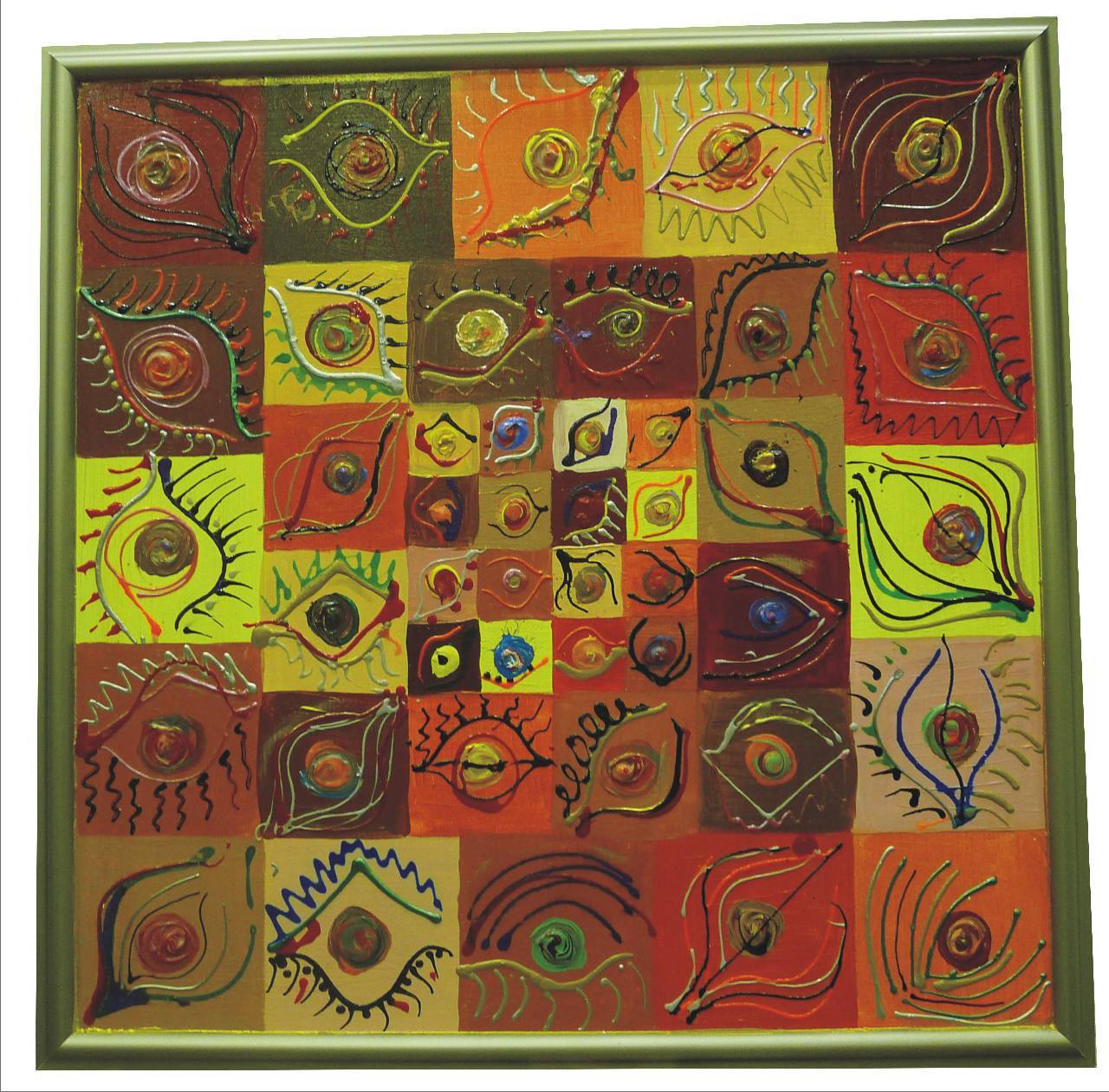 Obraz akrylowy, technika mieszana, podłoże płyta mdf ,rama aluminiowa w kolorze satyny – odcień brązu, przygotowany do powieszenia w dowolnej pozycji bez potrzeby ramy i dodatkowych mocowań, fakturalny, boki zamalowane w tonacji obrazu, werniksowany, sygnowany, wymiar 74,5cm x 74,5cm.