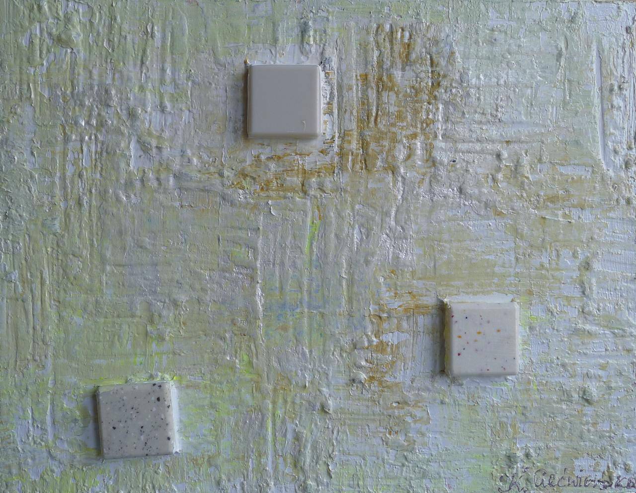 Obraz akrylowy, kolaż, elementy akrylu, podłoże płyta, krawędzie zamalowane w tonacji obrazu, ,werniksowany,sygnowany,przygotowany do powieszenia w dowolnej pozycji,powierzchnia obrazu fakturalna. Wymiar 45cm x 35 cm.