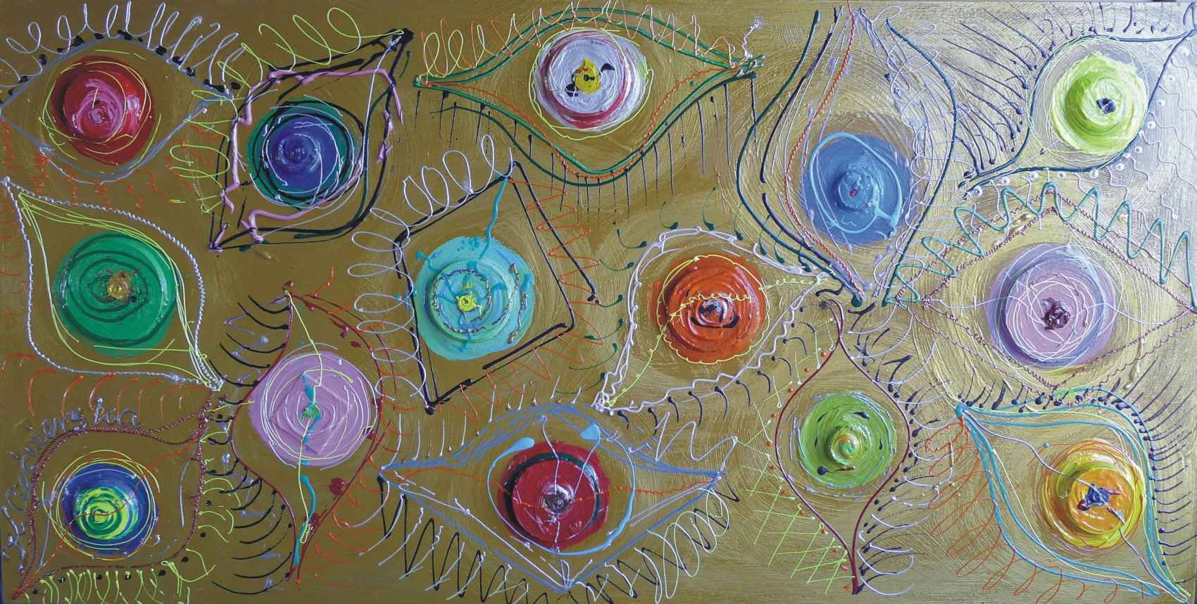 Obraz akrylowy, podobrazie płyta, kolaż, krawędzie zamalowane w tonacji obrazu, powierzchnia fakturalna, zabezpieczony werniksem, przygotowany do powieszenia – nafrezowania umożliwiające powieszenie obrazu bez potrzeby ramy i dodatkowych mocowań.