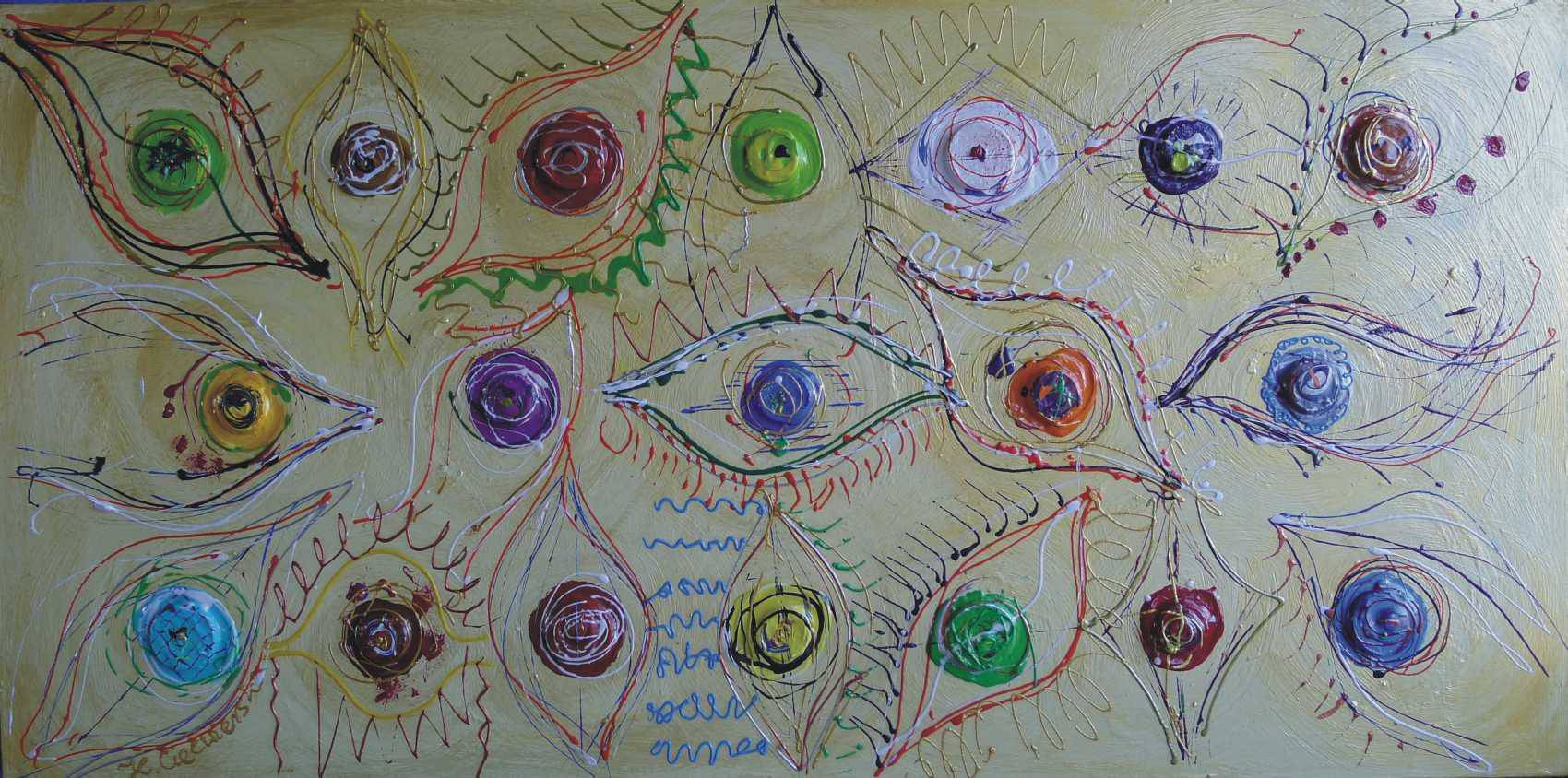 Obraz akrylowy, podobrazie płyta, kolaż, krawędzie zamalowane w tonacji obrazu, powierzchnia fakturalna, zabezpieczony werniksem, przygotowany do powieszenia – nafrezowania umożliwiające powieszenie obrazu bez potrzeby ramy i dodatkowych mocowań.