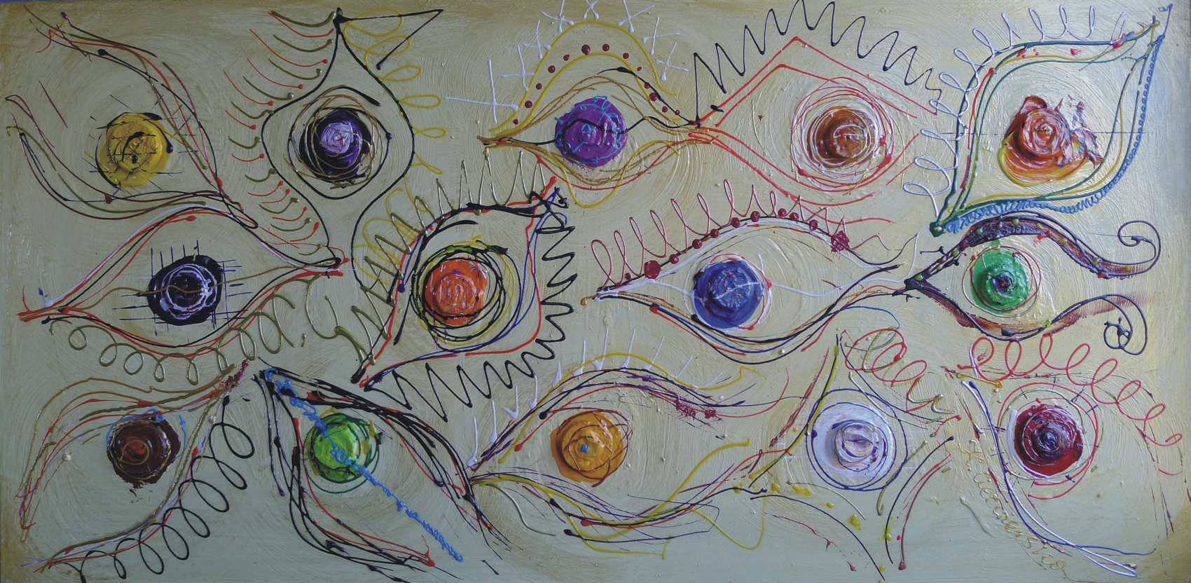 Obraz akrylowy, podobrazie płyta, kolaż, krawędzie zamalowane w tonacji obrazu, powierzchnia fakturalna, zabezpieczony werniksem, przygotowany do powieszenia – nafrezowania umożliwiające powieszenie obrazu bez potrzeby ramy i dodatkowych mocowań.