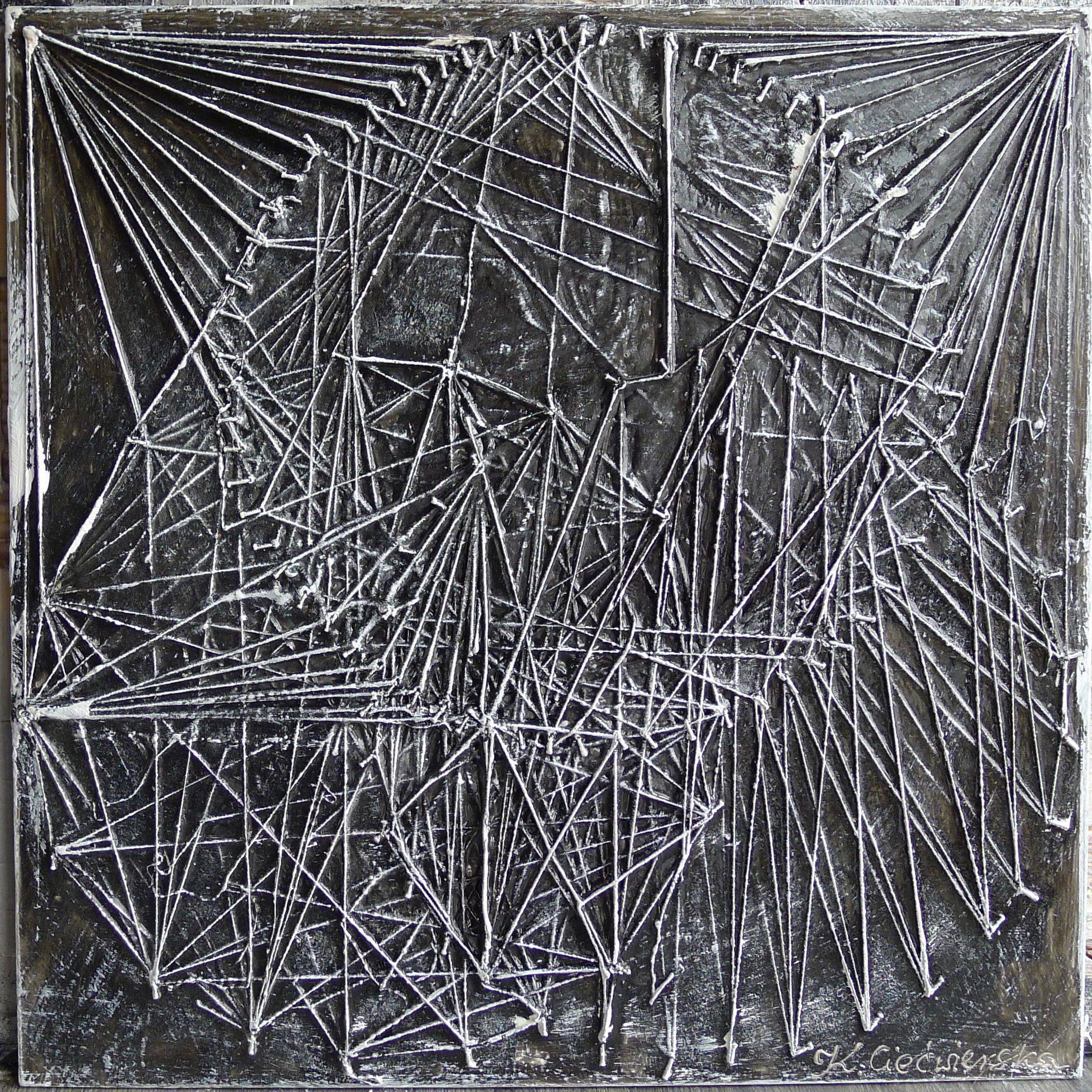 Obraz akrylowy, technika mieszana, podłoże płyta ,przygotowany do powieszenia w dowolnej pozycji bez potrzeby ramy i dodatkowych mocowań, fakturalny, kolaż, boki zamalowane w tonacji obrazu, werniksowany, sygnowany, wymiar 50cm x 50 cm x 2 cm.