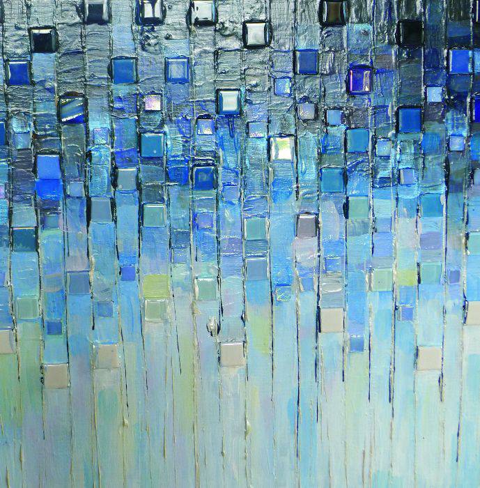 akrylowy,z elementami szkła i ceramiki, zabezpieczony werniksem,podłożem jest płyta laminowana,krawędzie zamalowane w tonacji obrazu, bez potrzeby ramy,przygotowany do powieszenia.