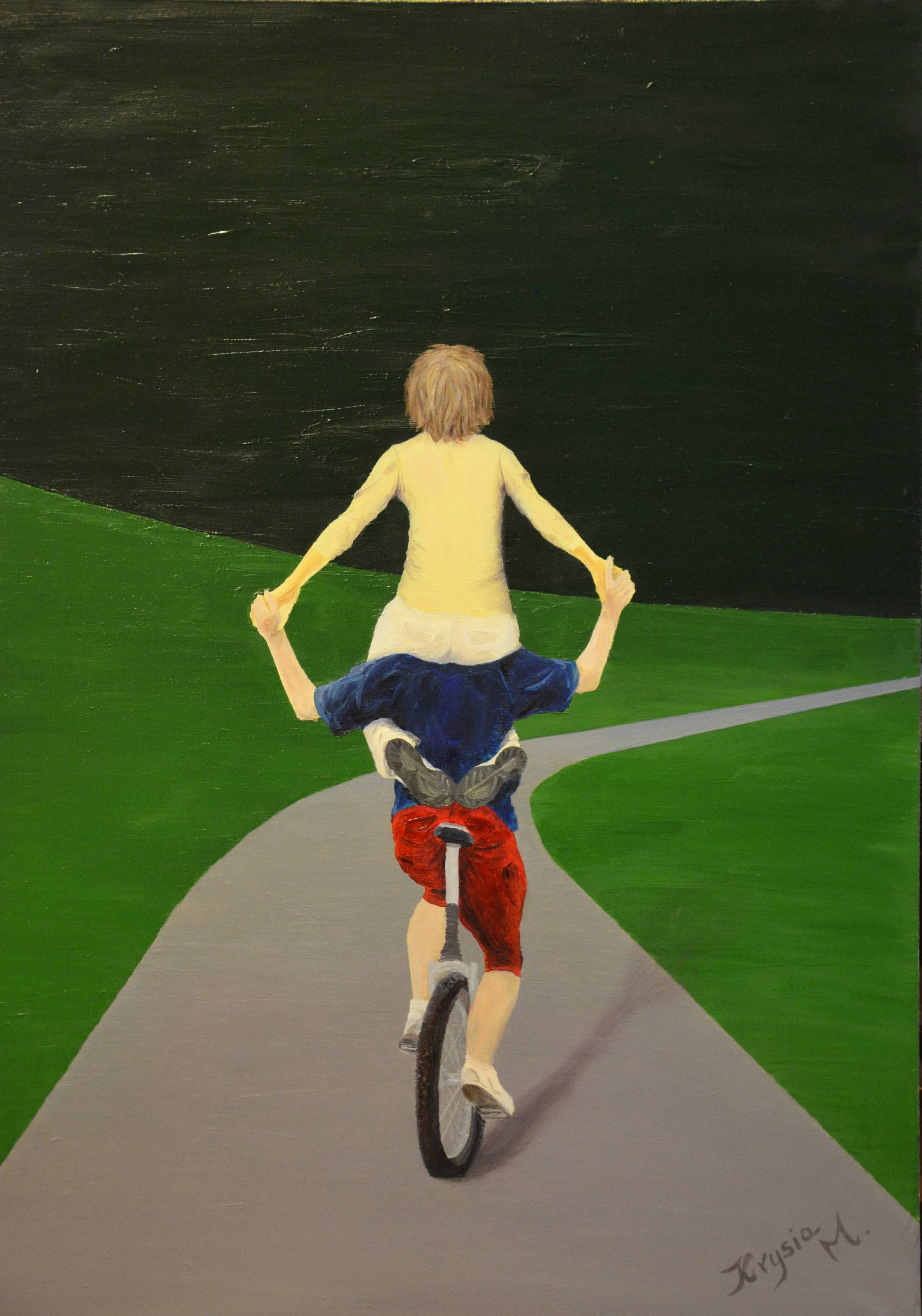 Obraz emanuje poczuciem beztroski i wolności, ukazując dwóch młodych ludzi na rowerze jednokołowym. Tło jest ciemnozielone, przypominające bujne łąki, a droga wijąca się przez centrum nadaje dziełu dynamiki. Postacie, z rozwichrzonymi włosami, oddają poczucie spontaniczności. Ich jasne ubrania kontrastują z ciemnym otoczeniem, co sprawia, że wyglądają jak małe białe plamki w wielkim zielonym morzu. Styl obrazu jest dość minimalistyczny, ale ukazuje pewną niewinność i radość chwili. Artysta użył prostych kształtów i wyraźnych kolorów, co nadaje obrazowi charakter easy-going i przyjemny dla oka. Ta prostota w formie świadczy o pewnym uroku dziecięcej naiwności. Dla odbiorcy, obraz ten może budzić nostalgiczne wspomnienia z dzieciństwa. Czujesz to ciepłe uczucie wolności, gdy słońce wpada na twarz, a wiatr bawi się włosami. Wywołuje też uśmiech, przypominając, jak niewiele potrzeba, by poczuć się szczęśliwym. Myślę, że to "freedom" jest kluczem do zrozumienia przekazu artystycznego. Obraz z pewnością pozostawia widza z refleksją nad pięknem prostych chwil życia. To tak, jakby oglądać radość namalowaną na płótnie.