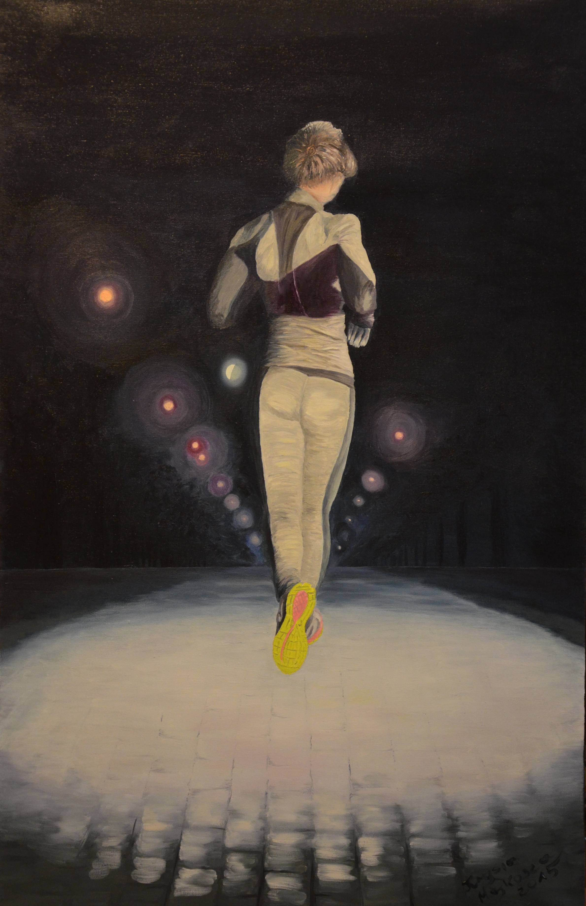 Na obrazie dominuje ciemność nocnego nieba, nad którą wyłania się postać biegającej osoby. Sylwetka jest oświetlona miękkim światłem latarni, które tworzy na drodze wyraźne, świetliste kręgi. Kobieta ubrana jest w strój sportowy, jasny, kontrastujący z ciemnym tłem. Żółte podeszwy jej butów zdają się wręcz świecić, nadając całości dynamiczny character. Atmosfera obrazu jest tajemnicza, może nawet trochę melancholijna, jakby coś wisi w powietrzu. Artysta wykorzystał technikę olejną, łącząc ciepłe i zimne kolory, co dodaje głębi i przestrzeni. Pociągnięcia pędzla są delikatne, subtelnie modelując kształty i cienie. Dla mnie niesie to echo samotności, determinacji, z nutą wolności. Czy to biegnie za marzeniem czy przed nim ucieka? Who knows. Dzieciak powiedziałby: "Ona biega jak najszybszy superbohater!" i dokładnie tak to wygląda – jak chwila, której nie wycenisz. Obraz prowokuje do refleksji, wywołuje niezbadane emocje i pozostawia odbiorcę z pytaniem o własne cele i samotne wieczorne wędrówki.