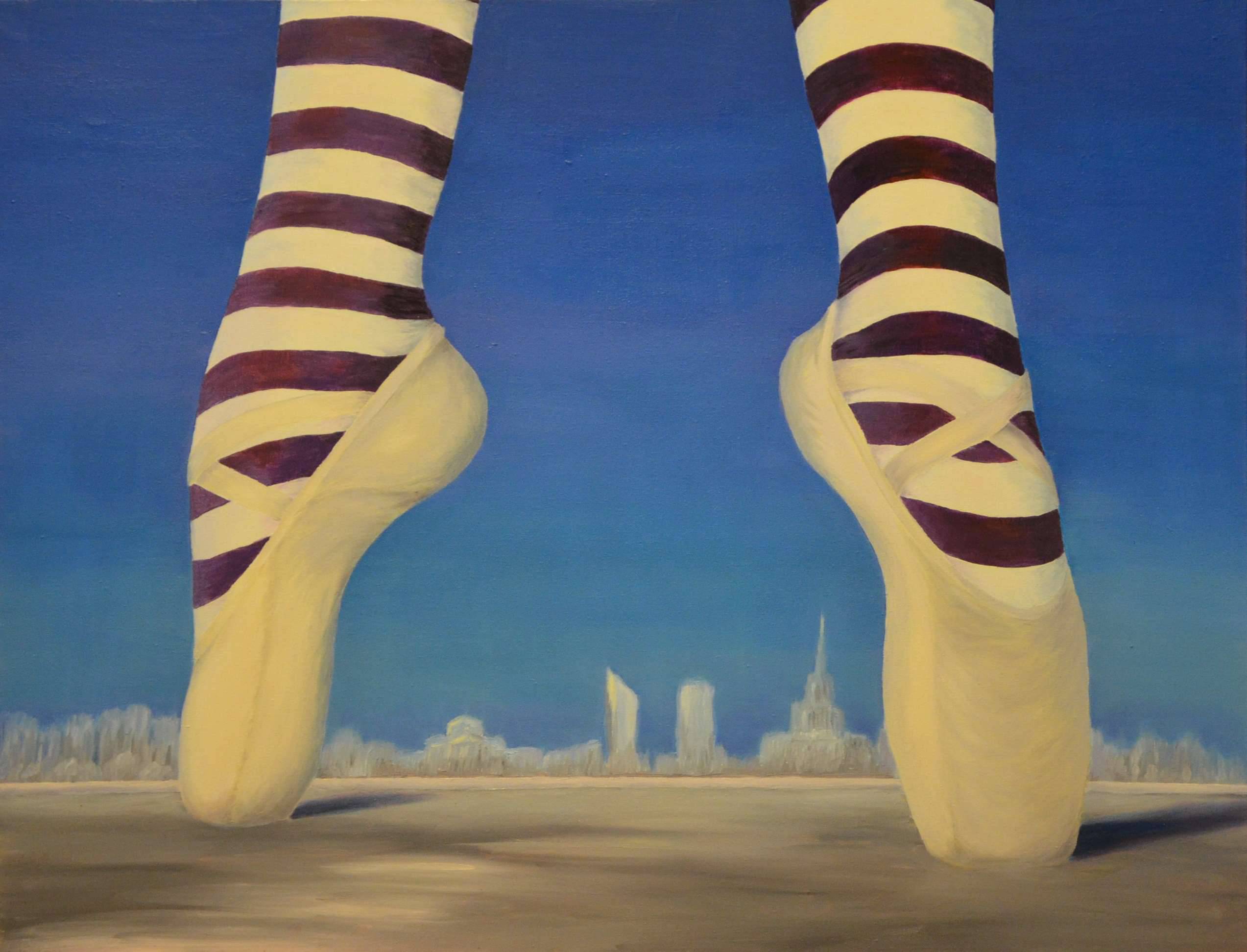 Na obrazie widzimy dwa baletowe pointy unoszące się ponad panoramą miasta, jakby tańczyły w powietrzu. Całość emanuje spokojną, niemalże magiczną atmosferą, której towarzyszy miękki błękit nieba, przechodzący w jaśniejszy odcień przy horyzoncie. Uwagę przyciągają wyraźne, kontrastowe pasy na rajstopach tancerki, dodające obrazu dynamiki. Twarde linie i delikatne rozmazanie tła tworzą unikalną kompozycję, która balansuje między realizmem a oniryzmem. Artysta użył techniki olejnej, co widać w delikatnie płynnych przejściach kolorów, oraz w umiejętnym wykorzystaniu światła i cienia. Możesz poczuć, jak te pointy zaraz ożyją, jakby miały "journey" poza granice płótna. Obraz może wywoływać różnorodne emocje u widza – od zachwytu nad elegancją i gracją tańca, po lekki niepokój związany z nieco surrealistyczną scenerią. Kiedy patrzę na ten obraz, czuję wręcz dziecięcą radość i lekkość, jakbym znów miał siedem lat i żadnych zmartwień na głowie. Pointy wydają się być symbolem aspiracji, dążenia do osiągania wysokości, które na pierwszy rzut oka wydają się być poza zasięgiem. Ale kto wie? Może właśnie o to chodzi – by sięgnąć nieba.