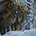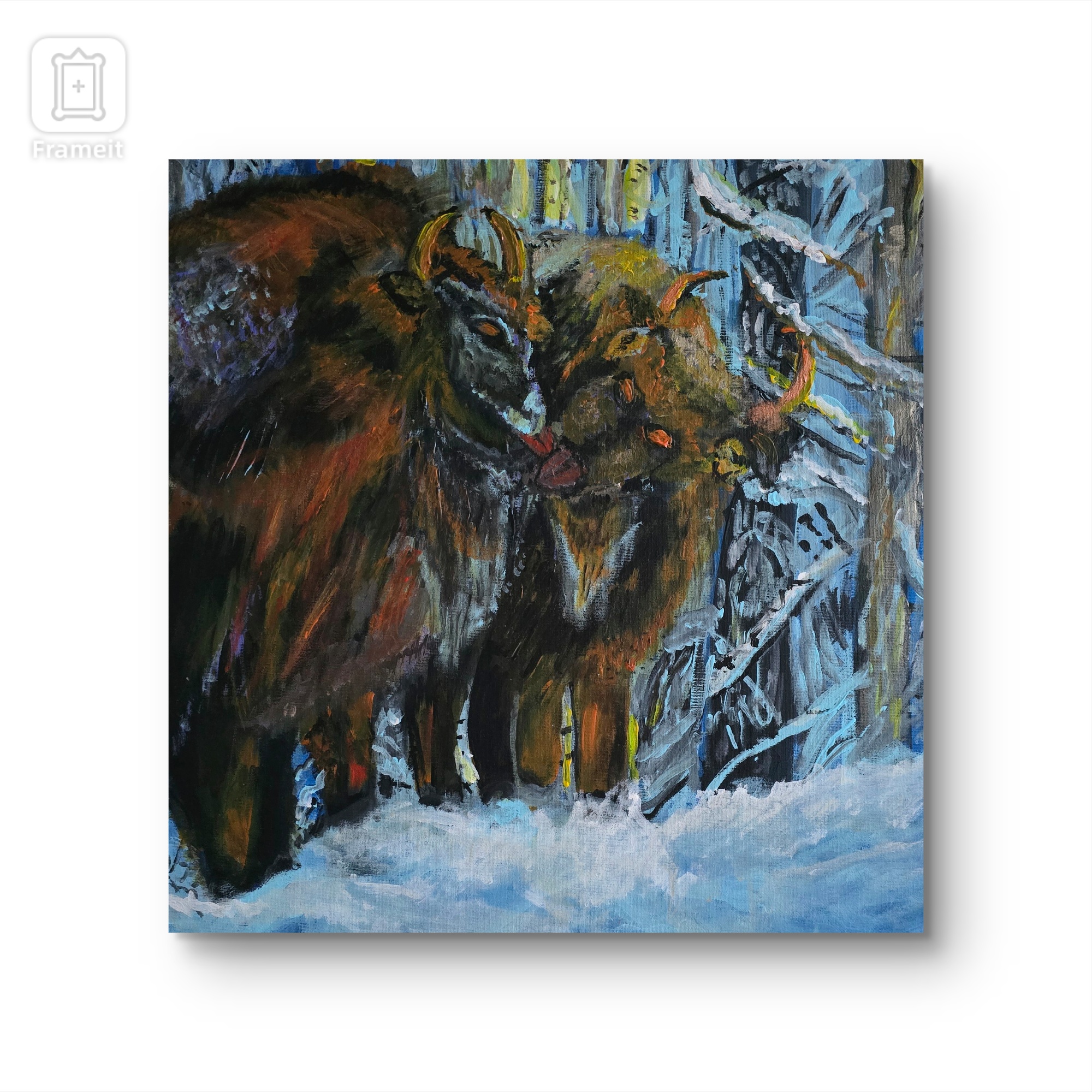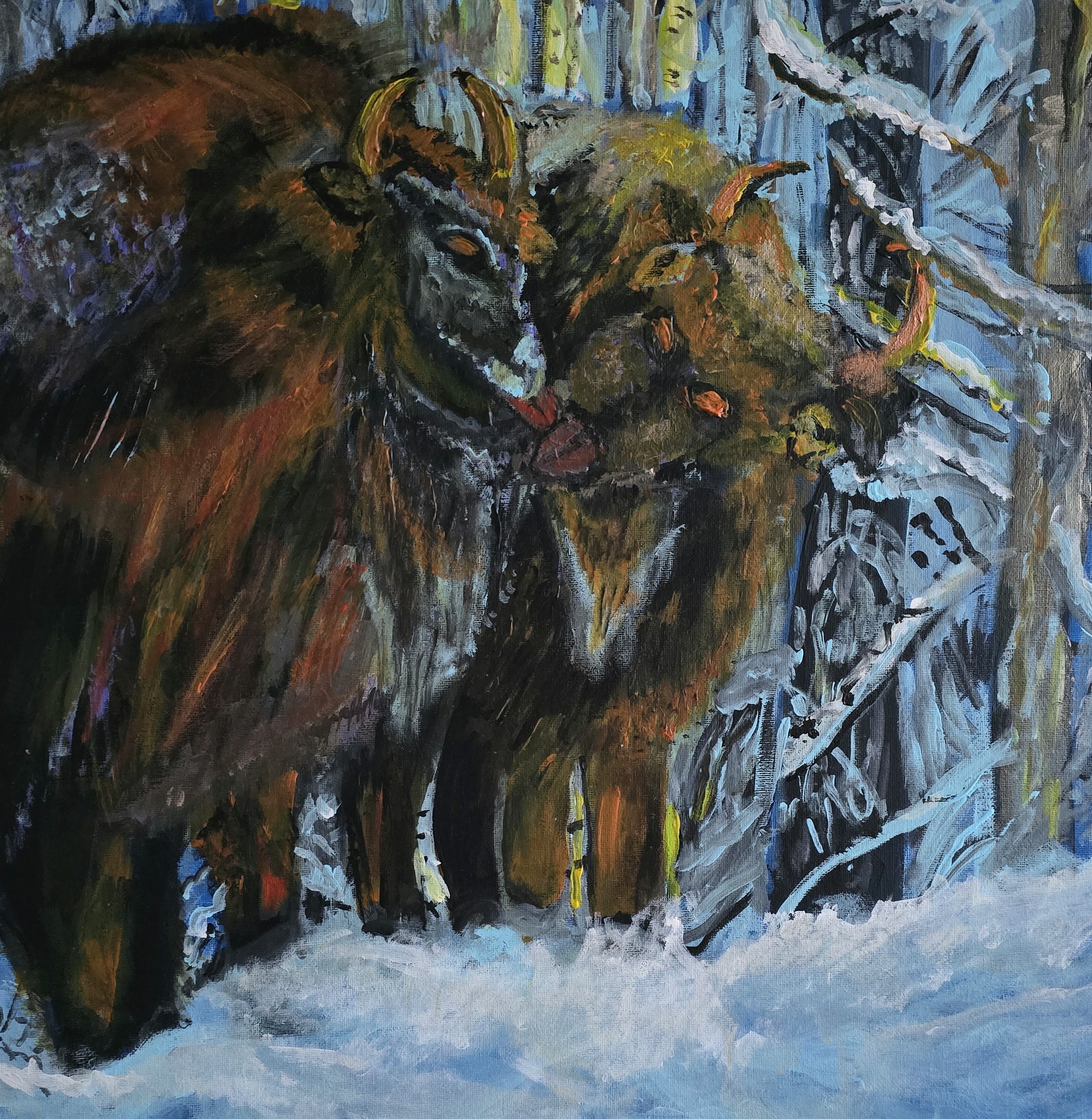 Na obrazie widzimy potężne żubry, które ukryły się w zimowym lesie. Dominują tu cieple odcienie brązu i rdzy, które kontrastują z chłodnymi błękitami i szarościami śniegu oraz nagich gałęzi. Zwierzęta wydają się silne i dostojne, jakby całkiem niezachwiane przez mroźną aurę. Można prawie poczuć chłód bijący od obrazu, a jednak wśród zimnej scenerii dostrzegamy ciepło wzajemnego wsparcia żubrów. Artysta śmiało użył grubych pociągnięć pędzla, co nadaje obrazowi dynamiczną fakturę. Jakby malował w zaciszu swojego "studio". A ja myślę, że te żubry są przyjaciółmi, co mnie urzekło. Nastrojowość dzieła ma w sobie coś pierwotnego i majestatycznego, przypomina o równowadze natury i surowości zimy. Obraz może wzbudzać w widzu hołd dla dzikiej przyrody i respekt dla jej nieujarzmionej siły. To także przypomnienie o wyjątkowości chwil zatrzymanych w czasie, jakby na chwilę zatrzymać się i spojrzeć poza codzienność.