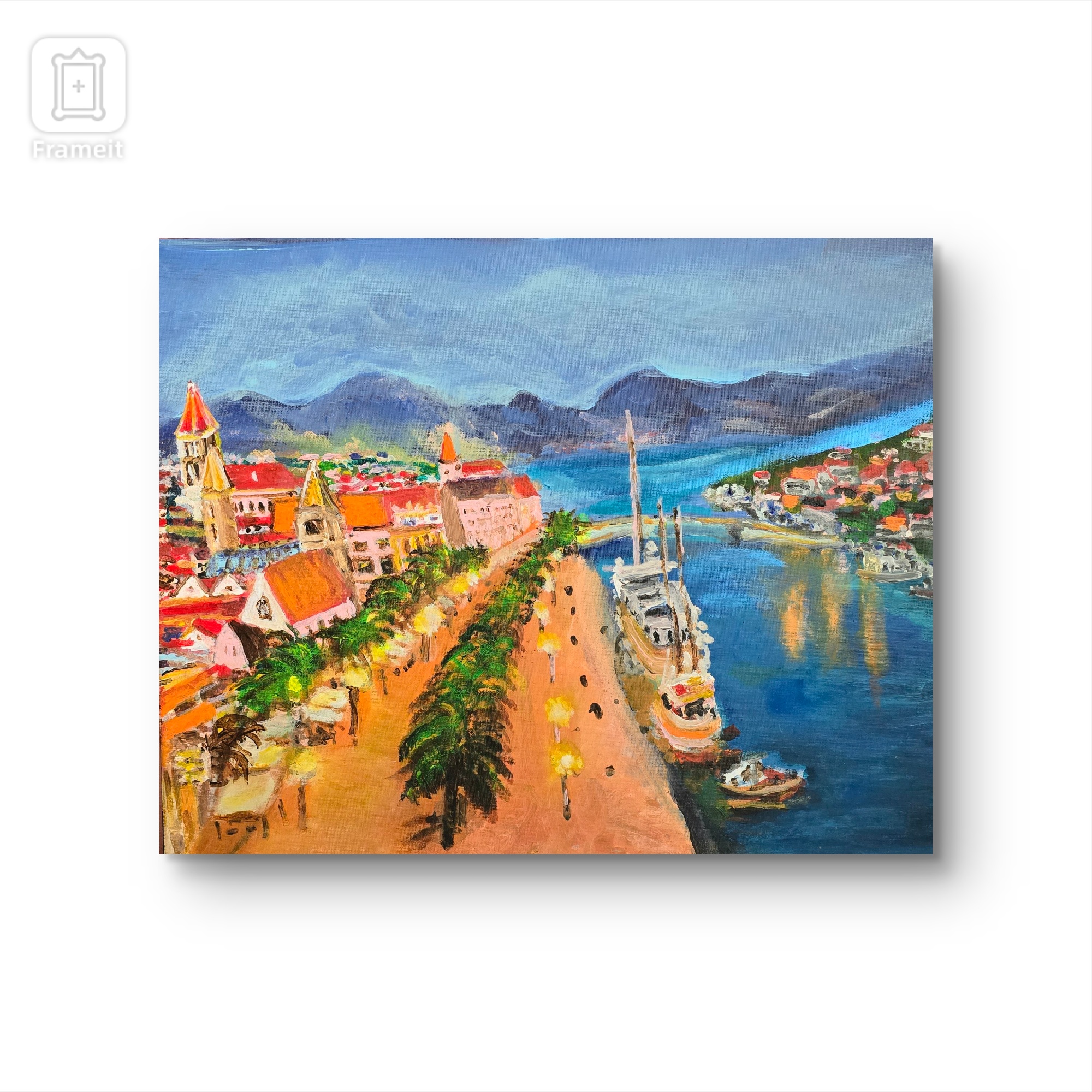 Na obrazie widzimy urokliwą panoramę miasta Trogir przy brzegu morza. Ciepłe odcienie pomarańczowego i różu dominują po lewej, tworząc sielską atmosferę. Z dołu płótna wyrasta zielona aleja drzew, prowadząca do portu, gdzie cumują statki leniwie kołyszące się na wodzie. Szaro-niebieskie góry w tle dodają głębi i spokojnej równowagi. Artysta wykorzystał dynamiczne, lekko niedbałe pociągnięcia pędzla, co nadaje obrazowi impresjonistyczny look. Patrząc na to dzieło, można poczuć ciepło lata. Słońce delikatnie odbija się od tafli wody, tworząc migoczące refleksy. Uśmiecham się na widok tych kolorowych dachów, przypominają mi wakacyjne spacery. Dziecko powiedziałoby: ale fajne łódki! Wybuch emocji jest tu nieunikniony, bo malarz umiejętnie zagrał kolorem i światłem, wywołując w widzu nostalgię i radość.