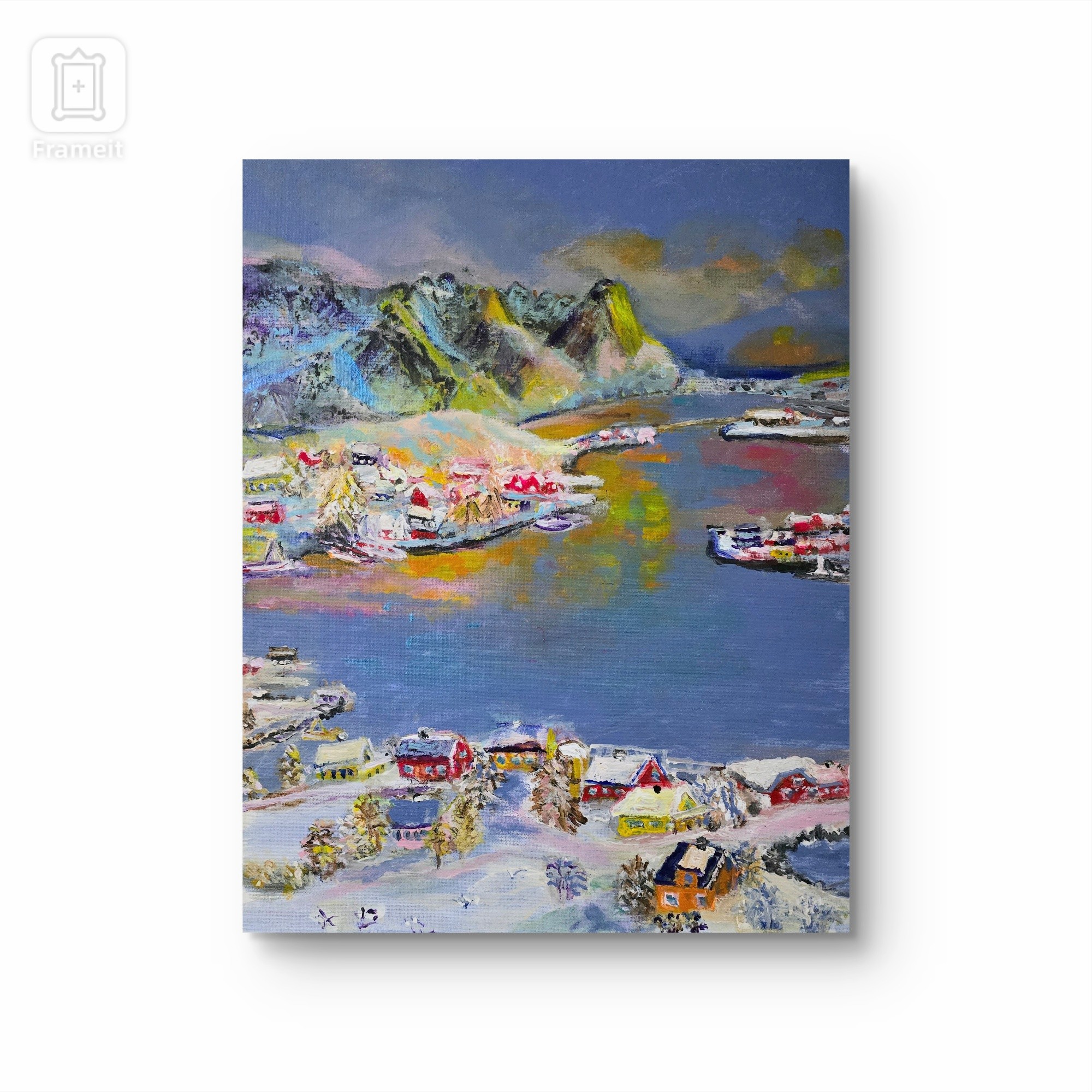 Pejzaż przedstawia malownicze zimowe miasteczko, skąpane w pastelowych odcieniach błękitu, różu i złota. Gdzieś tam w oddali widać majestatyczne góry pokryte śniegiem, które niczym strażnicy otaczają dolinę. Ich skaliste wierzchołki zdają się lśnić, gdy promienie słońca delikatnie rozpraszają się na szczytach. Obraz tchnie spokojem i ciszą zimowego poranka. Kompozycja jest dynamiczna, a zarazem harmonijna, przykuwająca wzrok swoimi subtelnymi przejściami kolorów. Wyraźnie dostrzegalne są techniki impasto i miękkiego pędzla, które nadają całości tekstury i głębi. Patrząc na ten obraz, odczuwam ciepło i błogość, jakby czas na chwilę zwolnił. Malutkie domki w wiosce wyglądają jak misie w kolorowych ubrankach, jakby ktoś złapał chwilę magicznej zimy. W sercu tego zimowego krajobrazu kryje się poczucie nostalgii i wspomnień z dzieciństwa, które przywodzi na myśl bajkowe opowieści. To prawdziwy winter wonderland, w którym każdy detal opowiada swoją małą historię. Czy kiedykolwiek marzyłeś o takim miejscu?