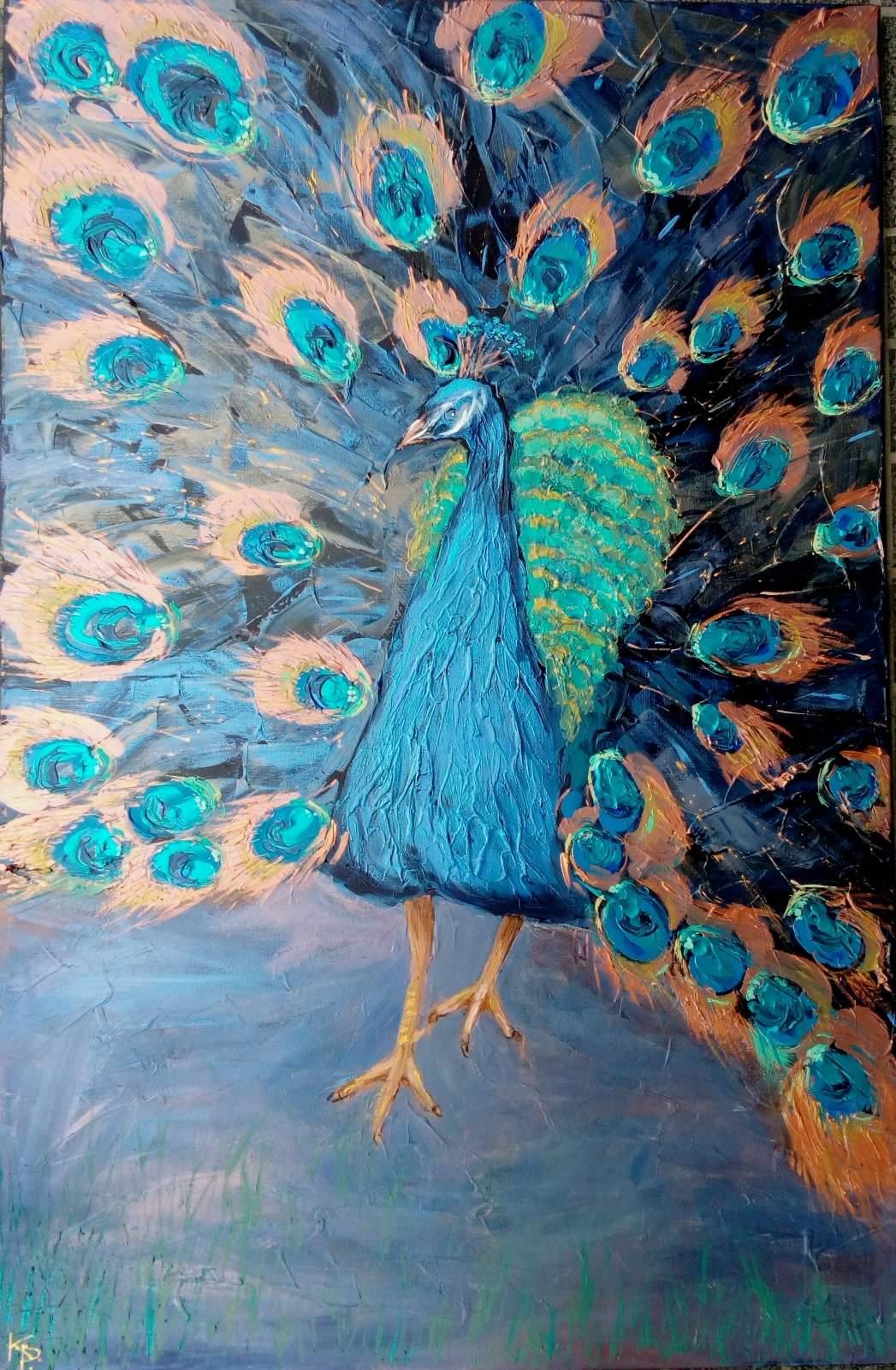 Na obrazie widzimy majestatycznego pawia, którego pióra rozpościerają się na całą szerokość płótna. Dominuje bogaty, niebieski kolor, który przechodzi w głębokie odcienie turkusu i zieleni. Pióra pawia są pełne detali, z jaśniejszymi, błyszczącymi elementami, które tworzą wrażenie ruchu. Artysta zastosował grubą warstwę farby, technikę impasto, nadając teksturę i trójwymiarowy efekt. Nastrój jest pełen spokoju i elegancji, jakby czas stanął w miejscu. Ten obraz jest jak okno do świata pełnego niezwykłych barw i harmonii, a patrząc na niego, można poczuć się częścią tej magicznej sceny. Dziecko mogłoby powiedzieć: "Paw ma więcej kolorów niż kredki!". Styl jest ekspresyjny, z nutką surrealizmu, przynosząc emocje zachwytu i podziwu. Czuję energię i piękno natury, które ekscytują w sposób, który może być described as breathtaking. Ciekawość, te wszystkie kolory, po prostu nie można oderwać wzroku. Niezależnie od perspektywy, obraz pozostawia miejsce na własną interpretację, na zanurzenie się w ten kolorowy rytm życia.