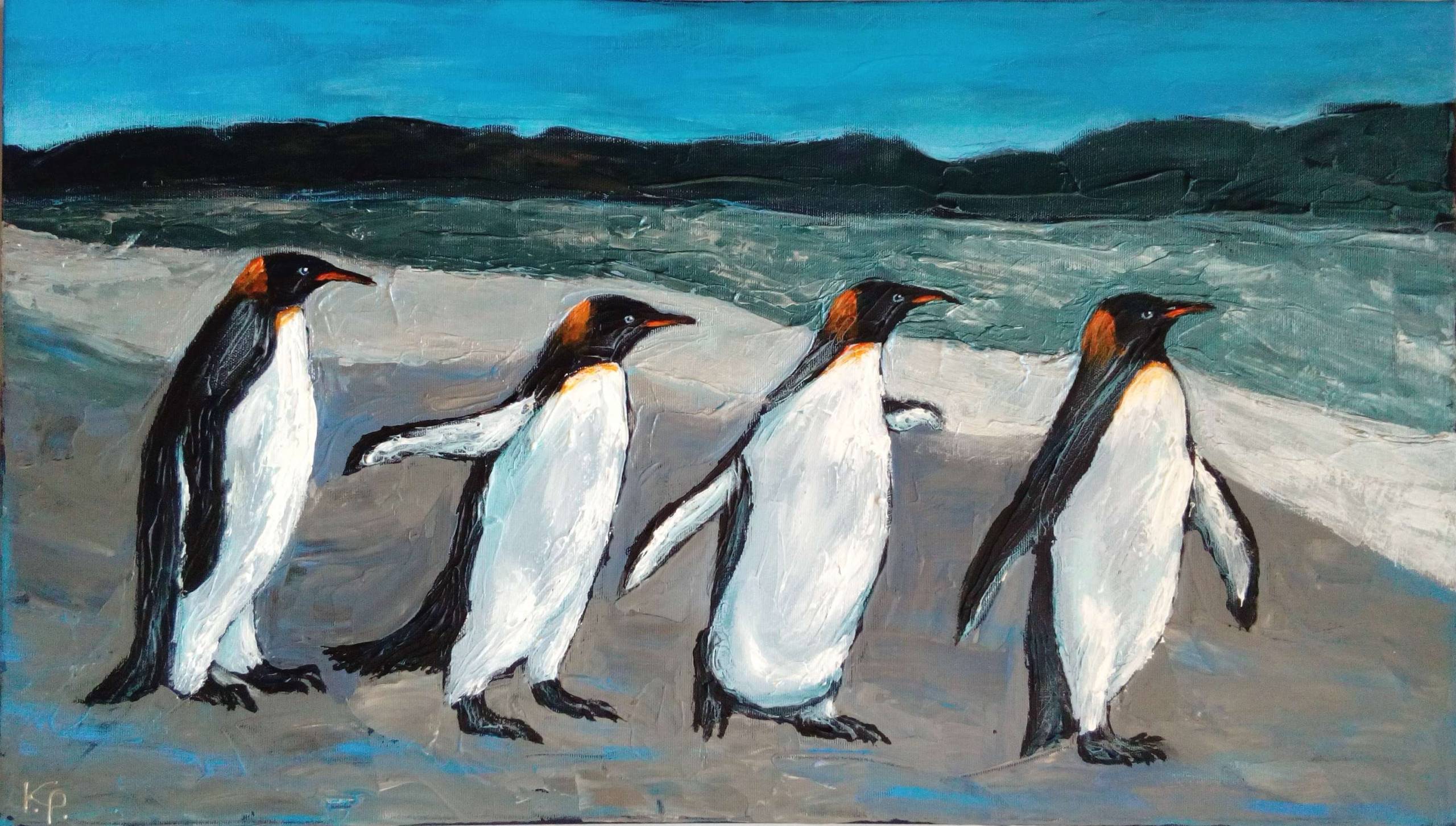 Obraz przedstawia cztery pingwiny maszerujące w równej linii w stronę nieznanego celu. Tło jest malowane w odcieniach błękitu i szarości, co nadaje scenie mroźny, surowy klimat. Pingwiny, zaintrygowane otoczeniem, zdają się uczestniczyć w ich codziennym rytuale. Artysta użył wyrazistych pociągnięć pędzla, co dodaje żywiołowości i dynamizmu kompozycji. Błyszczące białe brzuchy kontrastują z czernią ich skrzydeł, tworząc harmonijną całość. Nastrój obrazu jest radosny, ale jednocześnie spokojny. Może wywoływać u odbiorcy uczucie zaciekawienia i nostalgii za nieznanym. To jak zima magiczna, gdy pada śnieg, a pingwiny idą na przygodę. Obraz emanuje pozytywną energią i przyciąga wzrok swoją prostotą, a jednocześnie bogactwem szczegółów. This painting can make you smile. Refleksyjna natura dzieła zachęca do zatrzymania się na chwilę i podziwiania piękna chwili uchwyconej na płótnie.