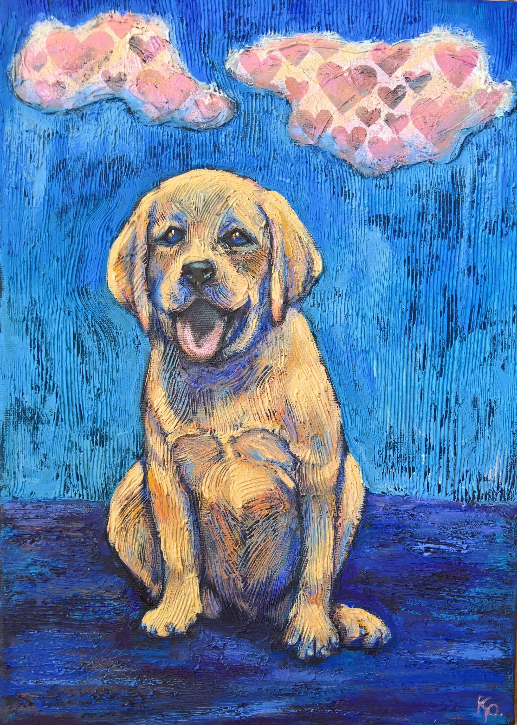Na tym obrazie widzimy uroczego szczeniaka siedzącego na tle intensywnie błękitnego nieba. Radosny psiak dominuje kompozycję swoim ciepłym, żółto-brązowym futerkiem, które kontrastuje z chmurami przypominającymi kłęby cukrowej waty. Chmury są różowe z elementami serduszek, dodając delikatnej, niemal bajkowej atmosfery. Czuć tu beztroskę i szczęście, jakby całość mówiła do nas “Welcome to puppy heaven!”. Ekspresyjny styl, pełen dynamicznych pociągnięć pędzla, nadaje obrazowi teksturę, co wzmacnia wrażenie trójwymiarowości. Patrząc na obraz, nie można się nie uśmiechnąć. Może wywoływać wspomnienia beztroskich chwil z dzieciństwa lub po prostu radość, jaką daje widok szczęśliwego zwierzaka. Podziwiam kunszt artysty, który umiejętnie posługuje się kolorem i fakturą, tworząc dzieło, które jest zarówno proste, jak i głęboko emocjonalne. Oj, jakbym chciał mieć takiego pieska w domu! Tak! Ja, mały Michaś, chcę tego pieska! Całość jest tak żywa, że niemal czuje się ruch i energię płynącą z obrazu. To sztuka, która nie pozostawia obojętnym.