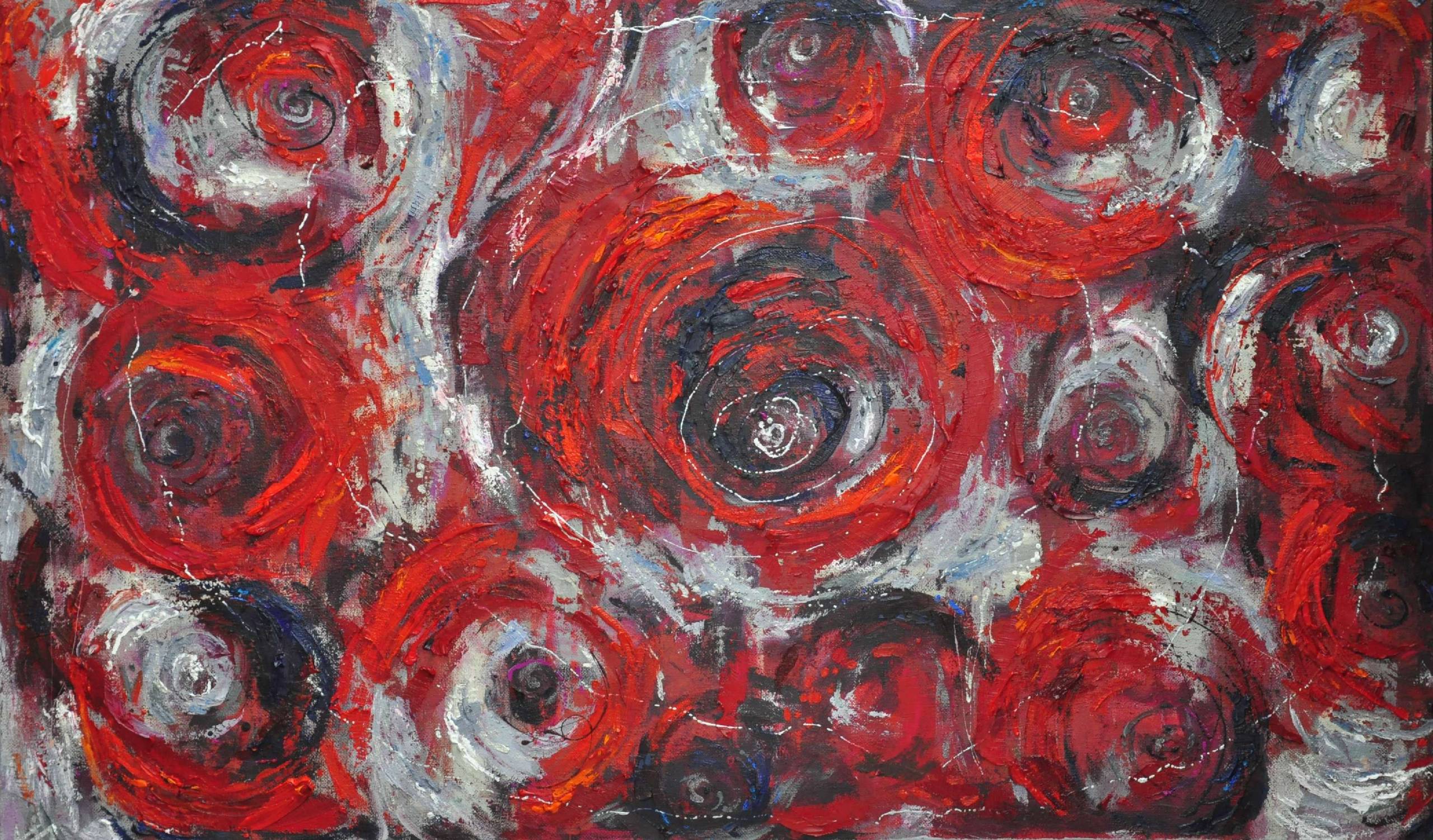 Na obrazie dominują wirujące czerwienie, które niczym tańczące płomienie przyciągają wzrok. Kompozycja jest dynamiczna, pełna ruchu i energii. Przenikają się czerwone, czarne i szare barwy, tworząc harmonię nieprzewidywalności. Artysta użył grubych pociągnięć pędzla, co nadaje pracy surowości i ekspresji. Można się łatwo zagubić w wirze, który przypomina zarówno chaos, jak i piękno natury. Obraz emanuje nastrojem tajemnicy i niepokoju, ale też fascynacji. Abstrakcyjne formy mogą przywodzić na myśl zarówno kwiaty, jak i burzowe niebo. Wow, te kolory wirują jak karuzela w parku! Technika impasto dodaje głębi przez wyraźne tekstury, co sprawia, że aż chce się dotknąć powierzchnię płótna. Dzieło może wywoływać w odbiorcy mieszankę emocji, od zachwytu po niepewność. Może to być też czas na mały "introspection". To taki rodzaj sztuki, który żyje własnym życiem, przekazuje energię i złożoność uczuć. Obraz porywa swoim nieposkromionym duchem i pozostawia odbiorcę w zadumie.