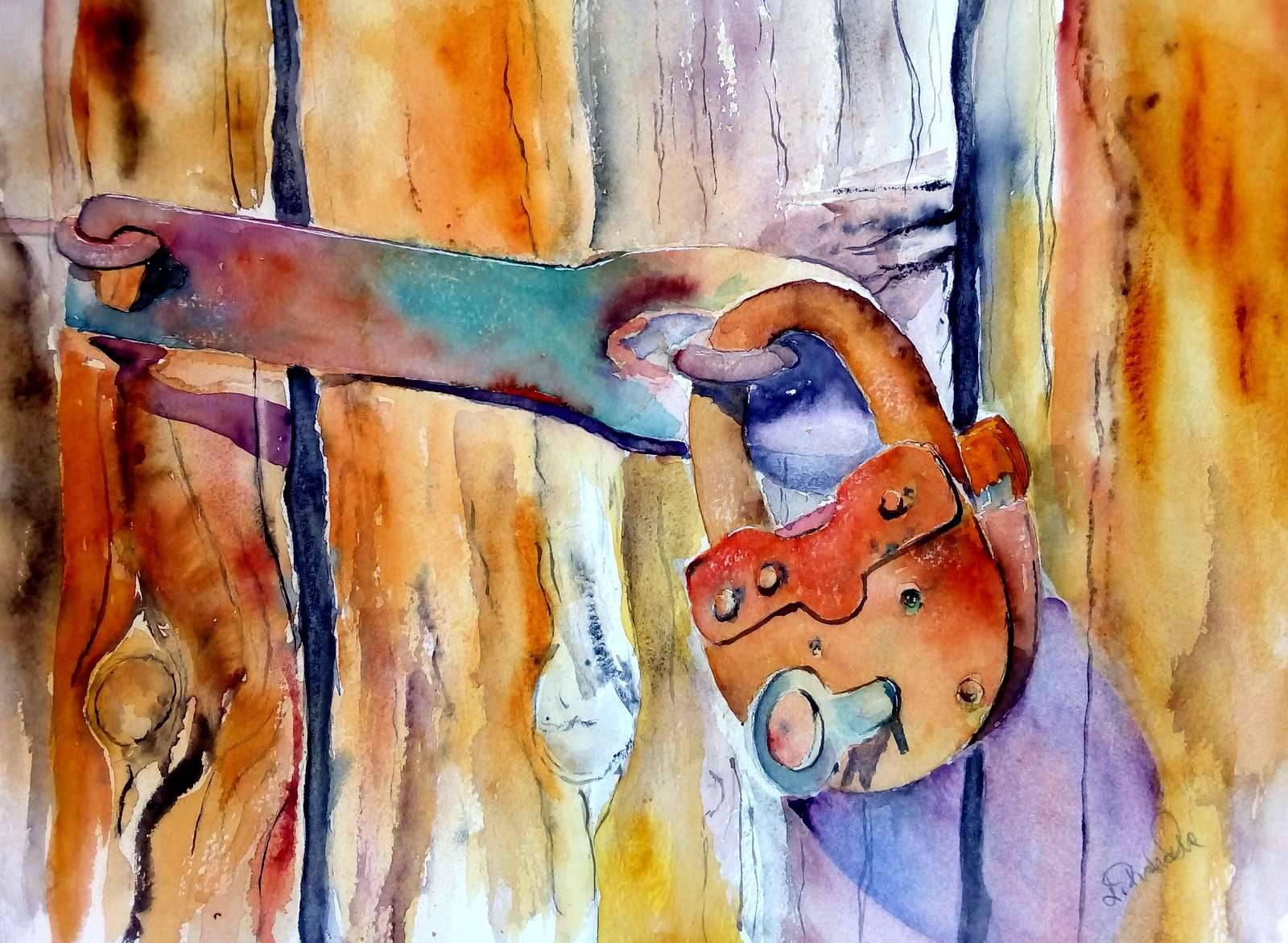 akwarela,na papierze,przedstawiająca kłódkę,z kluczykiem,w starej bramie