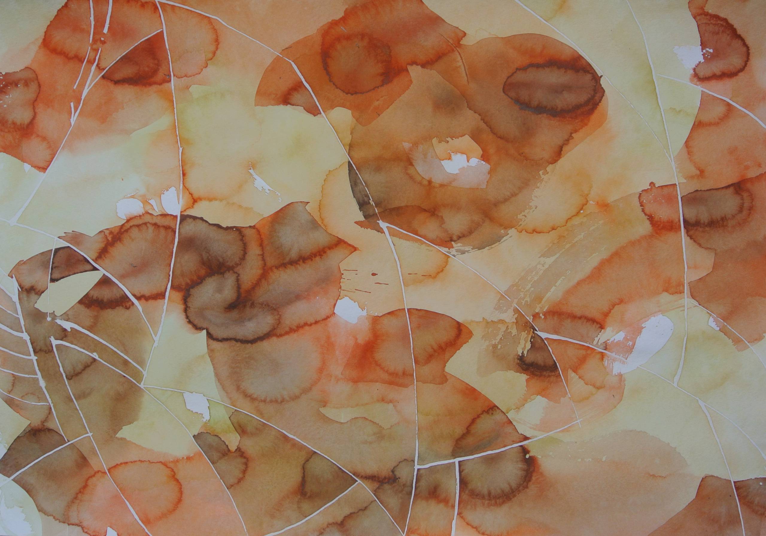 Patrząc na ten obraz, wciągamy się w niezwykłą grę ciepłych barw. Dominuje paleta pomarańczy, brązów i złamanych żółci, które harmonijnie się przenikają. Nieregularne kształty rozlewają się na płótnie, przypominając delikatne plamy akwareli, z ledwie zaznaczonymi liniami. Atmosfera dzieła jest spokojna, choć nieco tajemnicza. Jakbyśmy patrzyli na jesienny krajobraz lub mglisty sen. Artysta wykorzystał techniki akwareli, bawiąc się transparentnością i nakładając kolory warstwami. Tej twórczej ekspresji przydał delikatne snow-like białe linie, dodając dynamizmu. Obraz może wywołać różnorodne emocje. Jedna osoba poczuje ciepło i nostalgię, inna może dostrzec chaos i ruch. Jak ja to widzę? To jak radosne wspomnienie z dzieciństwa, gdy skakałam po kałużach w parku przy zachodzącym słońcu. Może nie każdy zrozumie ten taniec kolorów od razu. Dziecko powiedziałoby: "To wygląda jak kolorowe chmury na niebie". Tekstura i przejścia tonów sprawiają, że praca jest naprawdę engaging. Czysta magia na płótnie, która sprawia, że wracam do niej myślami.