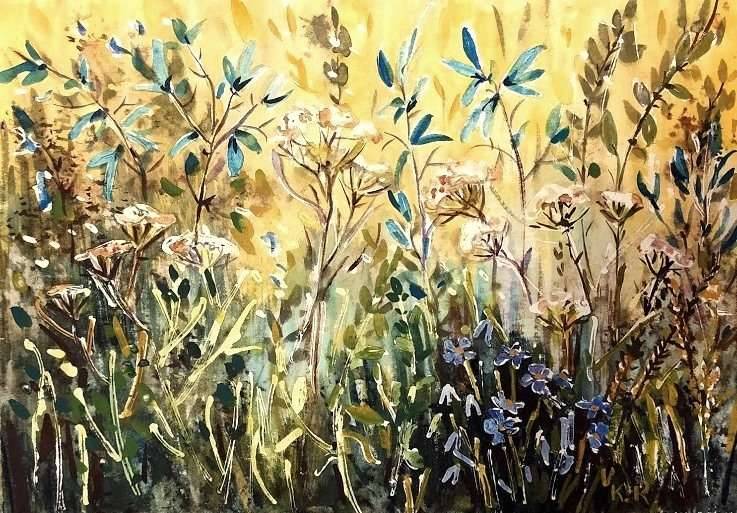 Obraz tętni kolorami, subtelnym chaosem dzikiej łąki w pełni lata. Dominują żółcie i zielenie, tworząc ciepłą, łagodną atmosferę. Między gałązkami i delikatnymi płatkami wyróżniają się niebieskie akcenty, które dodają intrygującego kontrastu. Kompozycja obrazu ma w sobie coś naturalnego, jakby artysta uchwycił moment z życia przyrody. Technika wydaje się być luźna i spontaniczna, z widocznymi pociągnięciami pędzla, które tworzą dynamiczny rytm. Widać tu swobodę i lekkość, trochę jak w dziecięcym malunku. Stoimy na polance. Czuje się jakby słoneczko delikatnie grzało twarz. Obraz emanuje spokojem, może nawet odrobiną nostalgii. Wzbudza uśmiech i chęć ucieczki od miejskiego zgiełku. Hey, jest coś magnetycznego w tej prostocie i naturalności. Ktoś mógłby sobie pomyśleć, że to tylko rośliny. A jednak kryje się w nich coś magicznego. Patrzysz i od razu czujesz, jak puszczasz wszelkie troski wolno. Idealne miejsce na chwilę odpoczynku, nie uważasz?