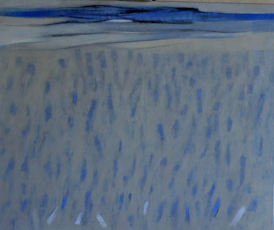 Obraz emanuje spokojem i delikatnością, choć z pozoru wygląda na prosty. Dominują w nim odcienie niebieskiego, które przeplatają się z delikatnym szarym tłem. U góry widać głęboki granat przywodzący na myśl spokojne morze, natomiast niżej kolory rozmywają się, przypominając mgłę lub lekką mżawkę, jakby malowane akwarelą. Te abstrakcyjne kształty układają się w niewidzialny rytm, tworząc kompozycję pełną harmonii. Artysta zastosował technikę subtelnych przejść kolorystycznych, co podkreśla eteryczność i ulotność przedstawionego pejzażu. Look! Te plamy wręcz tańczą na płótnie. Atmosfera obrazu jest lekko melancholijna, ale nie przytłaczająca. Przynosi na myśl spokojne dni nad wodą, kiedy czas płynie wolniej. To taki moment refleksji, kiedy można zatrzymać się na chwilę i poczuć zjednoczenie z naturą. Obraz może budzić w odbiorcy poczucie ulotności chwili, jednocześnie dając odczucie spokoju. Patrząc na niego, można odnieść wrażenie, że czas przestaje istnieć, a my zanurzamy się w marzeniach. Jedno jest pewne - to takie magiczne something.