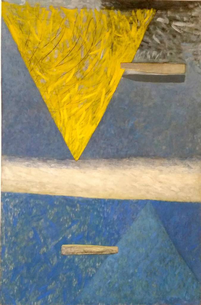 Na obrazie widać geometryczną abstrakcję, która przyciąga wzrok żywymi kolorami i dynamiczną kompozycją. Dominującym elementem jest żółty trójkąt, który wisi w niebieskim tle o zróżnicowanej fakturze. Całość tworzy ciekawy kontrast, przyciągając uwagę na kształty i linie. Dodatkowe prostokątne elementy wydają się unosić, co dodaje trzeciego wymiaru. Atmosfera jest jednocześnie spokojna i pełna energii, jakby obraz mówił "hey, spójrz na mnie". Artysta zastosował techniki mieszane, co widać w strukturze farby i sposobie układania kolorów. Można poczuć radość i niepokój, jakby dzieło chciało opowiedzieć niejednoznaczną historię. A nastrój - to jak balans między harmonią a chaosem żywym. Dziecko by powiedziało: "patrz, fajny trójkąt!". To dzieło wydaje się mówić, że czasem chaos może być piękny, a spokój jest w kolorach. Feeling obrazu jest jak spacer w zadumanym parku pełnym kolorowych liści. Fascynuje, inspiruje do refleksji nad urokiem prostych form i możliwościami jakie daje sztuka.