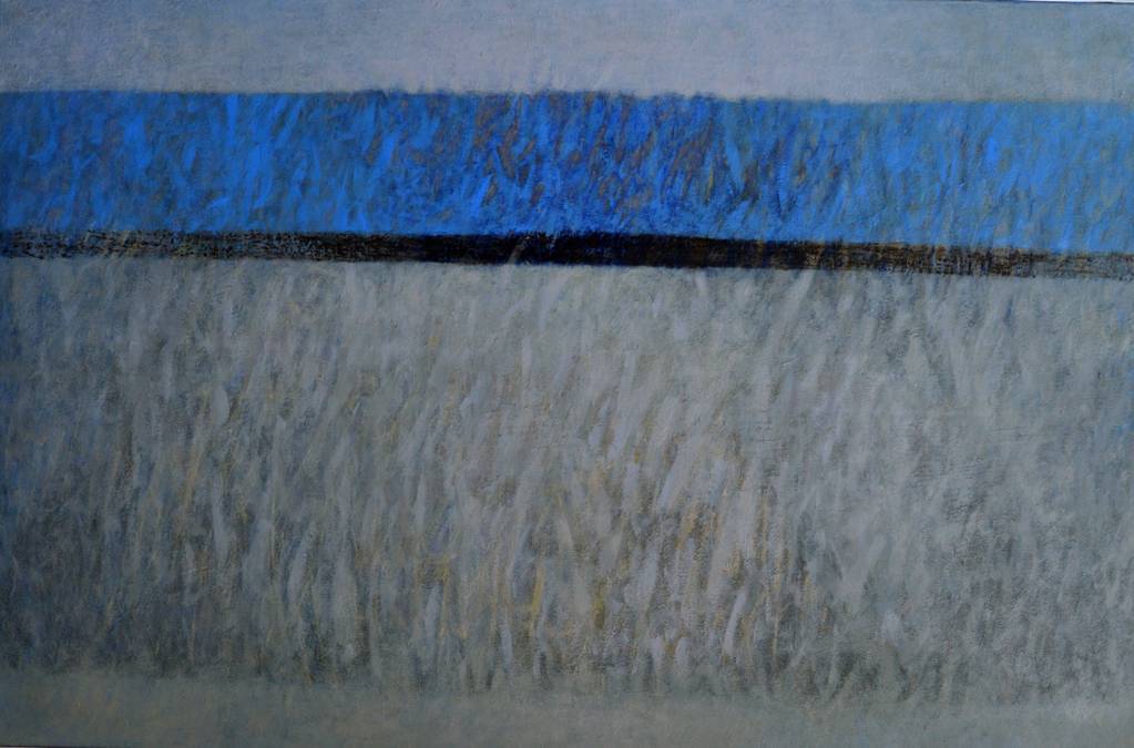 Obraz, który mamy przed oczami, intryguje swoją prostotą i oszczędnością formy. Dominują na nim chłodne barwy. Głównie to odcienie niebieskiego przekształcające się w szarości. Wyraźna pozioma linia dzieli płótno na dwie części. Góra rysuje się intensywnym, niemal elektryzującym błękitem, jakby artysta chciał oddać uczucie zimnego powietrza. Dół stonowany, imitujący cichą, spowitą mgłą równinę. Kiedy na to patrzę, czuję spokój i lekki niepokój zarazem. To takie artystyczne "calm before the storm". Styl? Mocno abstrakcyjny. Artysta wykorzystał technikę malowania warstwowego, co nadaje teksturze niepowtarzalnego charakteru. Pewne elementy zdradzają niedoskonałości, jakby pociągnięcia pędzla były wynikiem chwili, impulsu, co dodaje dziełu życia. Dziecko powiedziałoby: "To takie dziwne niebo nad nudną trawą". I coś w tym jest. Obraz emanuje chłodem, jakby przemawiał do nas surowością. Medytacyjny nastrój, doskonały do rozmyślania, ale też okazja do zadumy. Patrzę i myślę o bezkresie, o przestrzeni jeszcze nieodkrytej. Sam w sobie obraz jest mistyczny.