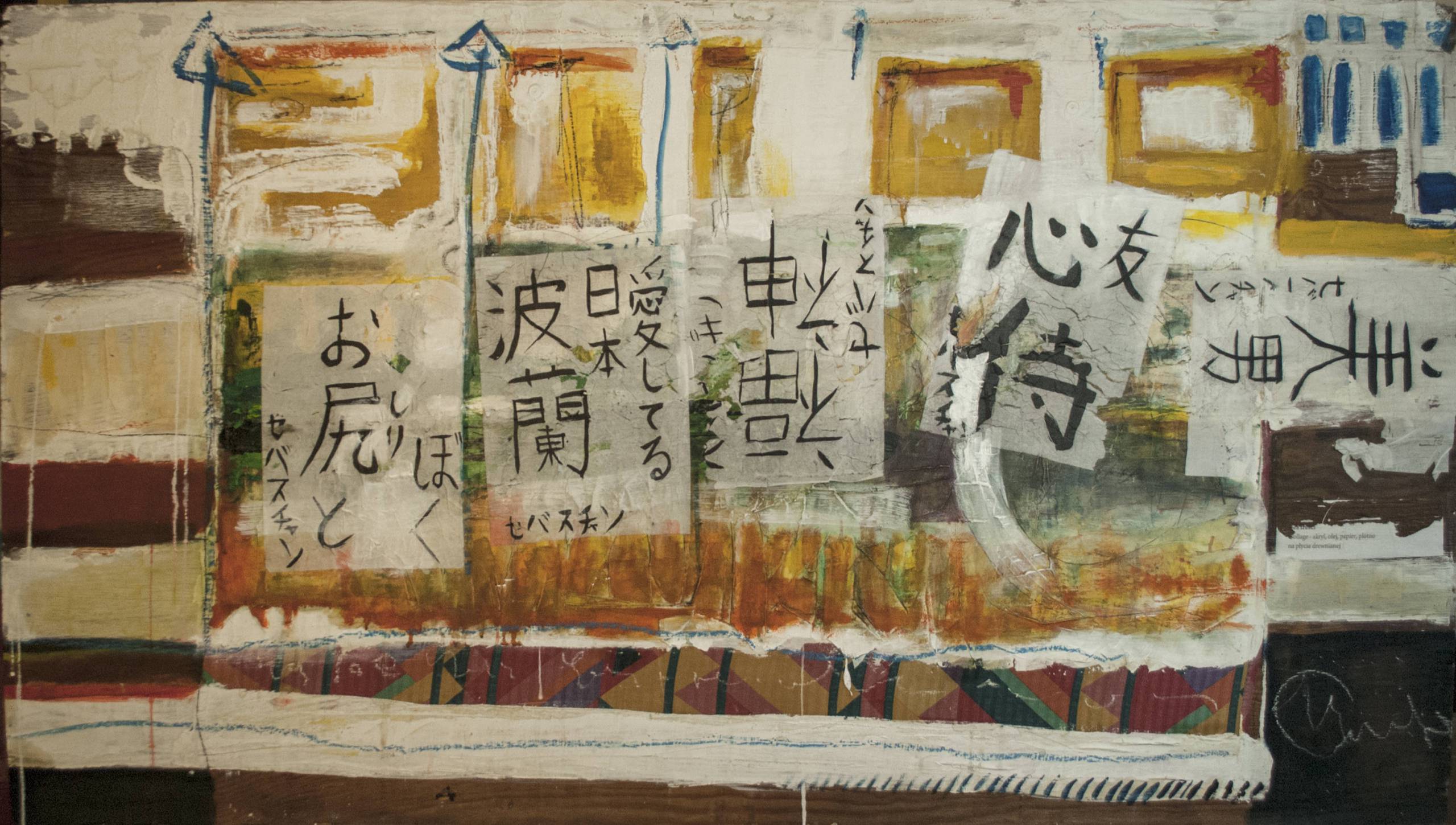 Praca w technice mieszanej - olej, akryl na sklejce z aplikacjami z papieru i tkaniny.