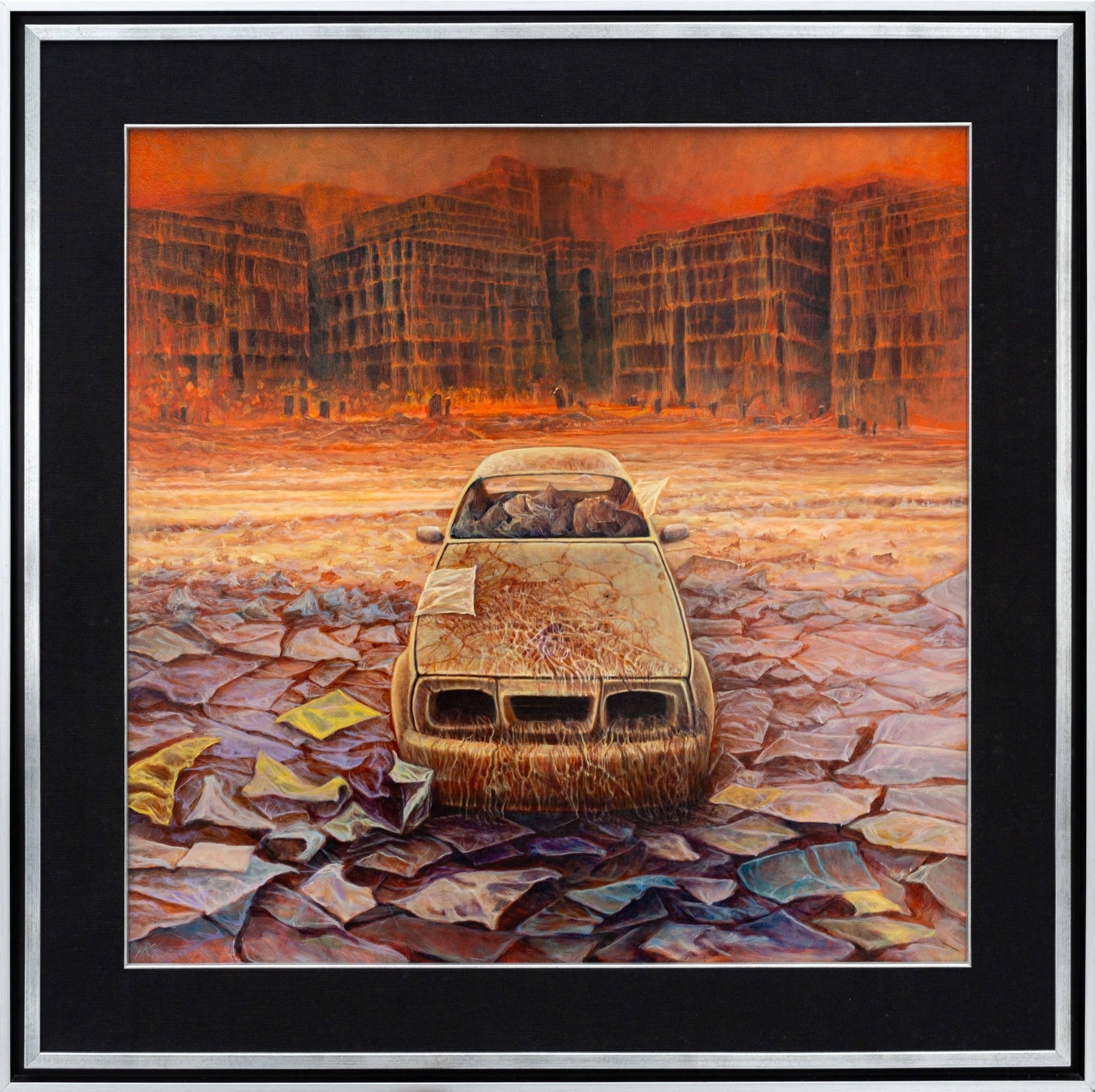 Na pierwszym planie stoi stary samochód jak wyrzut sumienia. Beżowa karoseria jest popękana rdzawą pajęczyną. Szyby matowe. Wnętrze zawalone szmatami i gratami. Auto tkwi w morzu płaskich brył i papierów. jakby ziemia była zrobiona z połamanych kafli. Tło to ciemne masy bloków. surowe prostokąty w brudnych brązach i czerniach. Nad nimi niebo płonie pomarańczem i czerwienią. Kompozycja jest centralna i bezlitosna. czuje się pustkę i gorąco. Technika wygląda na malarstwo z miękkim rozmyciem i gęstą fakturą pociągnięć. jak sen na jawie. Ja bym stąd uciekł. To jest smutne i troche straszne. W głowie pojawia się myśl o końcu miasta i o ciszy po wszystkim. Ten obraz jest bardzo creepy.