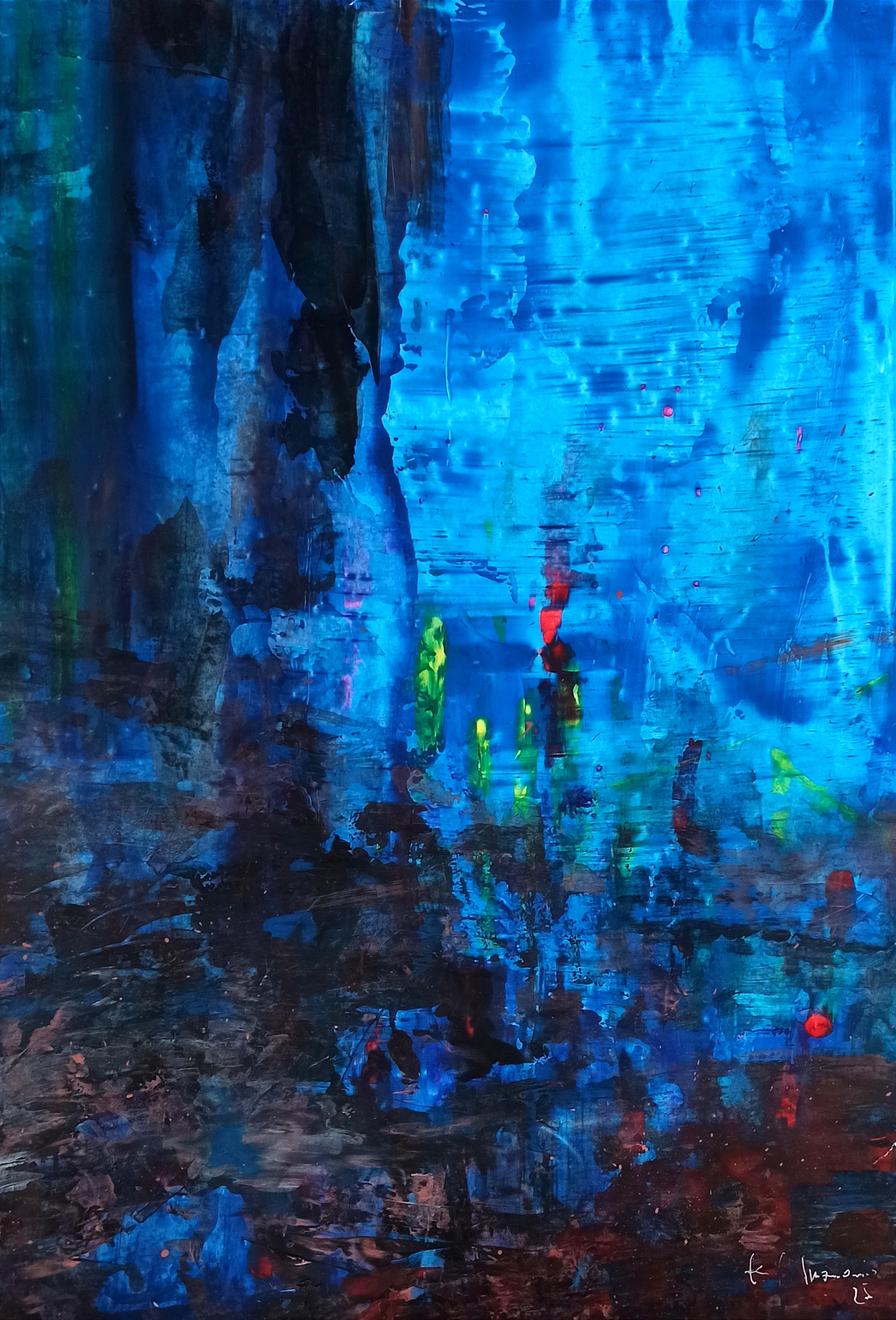 Na tym obrazie dominuje feeria odcieni niebieskiego, które przechodzą w niemal mroczne, czarne plamy, tworząc wrażenie tajemniczego głębinowego świata. Migoczące plamy w intensywnie czerwonym kolorze wprawiają w pulsujący rytm to, co początkowo wydaje się chaotyczną kompozycją. Artysta użył techniki impastu, co nadaje fakturze obrazu pewną szorstkość i dynamikę. Kolory przeplatają się jak fale oceaniczne, tętniące siłą i energią. Chłodna tonacja i płynne ruchy pędzla przypominają mi taniec światła na wodzie - to jakby płynąca fantazja. Obraz emanuje spokojem, ale jednocześnie kryje w sobie pewne napięcie. Jest w nim coś hipnotyzującego, jak gdyby chciał opowiedzieć historię ukrytą głęboko pod powierzchnią. Czai się tam cisza nocy i przeczucie nieodkrytych sekretów. To jak w filmie gdzie nigdy nie wiemy, co się wydarzy dalej. Widz patrząc na ten obraz może poczuć się jak w miejscu, gdzie czas się zatrzymał, zwabiony magią tego tajemniczego pejzażu. Różnorodność kształtów i chaos eksplodujących barw wywołują mieszane emocje - od nostalgii po fascynującą ciekawość. Dla dziecka to po prostu magiczne królestwo: "Jakby księżyc tańczył z gwiazdkami w morzu!" Ten obraz jest jak snucie opowieści, której nigdy do końca nie zrozumiemy, ale czujemy jej piękno - a touch of mystery wisi w powietrzu, przypominając o niezgłębionej naturze ludzkiej wyobraźni. Obraz jest oprawiony w passepartout i ramę aluminiową z pleksi. Wymiary ramy 110cm x 80cm.