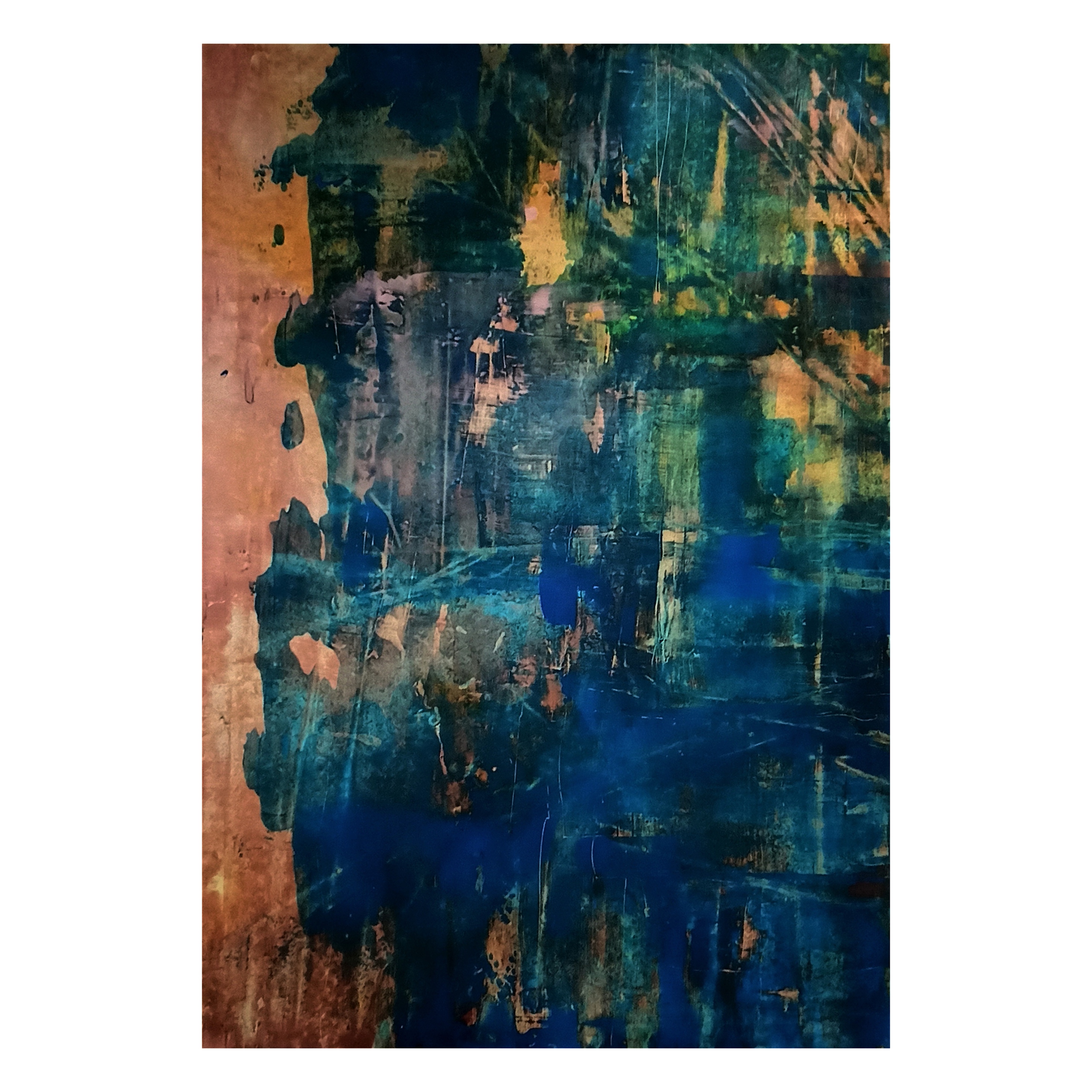 Obraz emanuje tajemniczą aurą dzięki bogatej palecie głębokich błękitów i zieleni, które kontrastują z cieplejszymi odcieniami brązu i żółci. Kształty są nieco rozmyte, jakby artysta chciał uchwycić chwilę niepewności czy ulotną myśl. Kompozycja wydaje się chaotyczna na pierwszy rzut oka, ale po chwili dostrzegamy subtelny balans i harmonię. Atmosfera jest nieco melancholijna, jakby obraz snuł opowieść o przeszłych chwilach, które teraz jawią się tylko jako wspomnienia. Artysta zastosował techniki przecierania farby, co dodaje dziełu wymiaru tekstury i głębokości. Wygląda to jak gra światła i cieni, co sprawia, że obraz nabiera dynamicznego charakteru. Może przypominać widok tajemniczego lasu w nocy albo głębokie oceaniczne przygody. To zdecydowanie piece of art, które pobudza wyobraźnię. Emocje, jakie wywołuje, mogą być różnorodne. Dla jednych to nostalgia, dla innych spokój czy nawet niepokój. Kiedy patrzę na ten obraz, myślę o nieodkrytych historiach i morskich głębinach. Moja mała siostra powiedziałaby pewnie, że to wygląda jak zatopiony statek pełen skarbów. To jedna z tych prac, które można interpretować na nieskończenie wiele sposobów. Fajnie, prawda? Obraz jest oprawiony w passepartout oraz ramę aluminiową z pleksi. Wymiar ramy 110cm x 80cm.