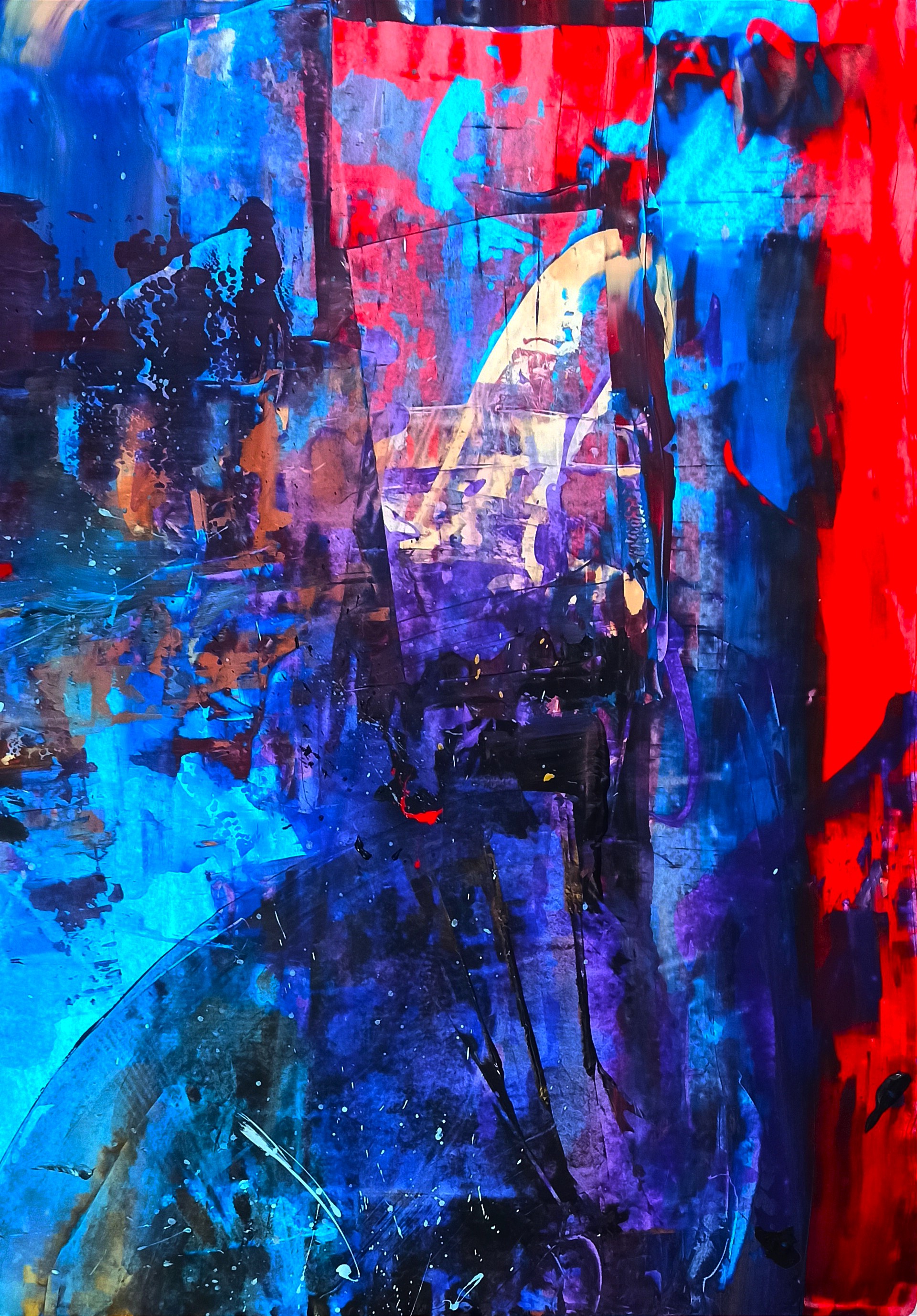Obraz z cyklu SPACES. Praca jest oprawiona w ramę aluminiową, passe-partout, oraz pleksi. Wymiar z oprawą 120cm x 80cm. Rama w kolorze czarnym.