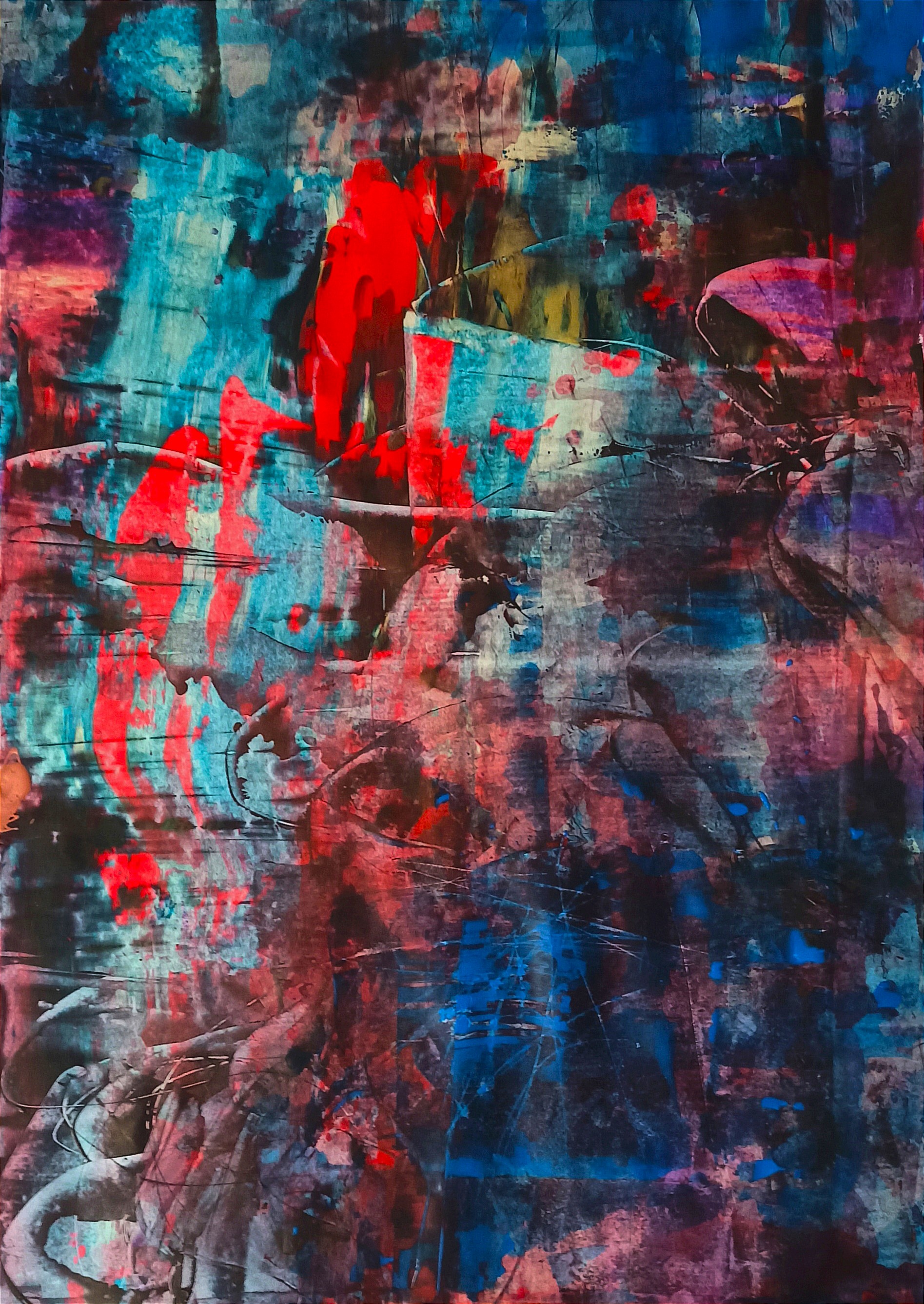 Obraz z cyklu SPACES. Praca jest oprawiona w ramę aluminiową, passe-partout, oraz pleksi. Wymiar z oprawą 100cm x 70cm. Rama w kolorze czarnym lub złotym, do wyboru.